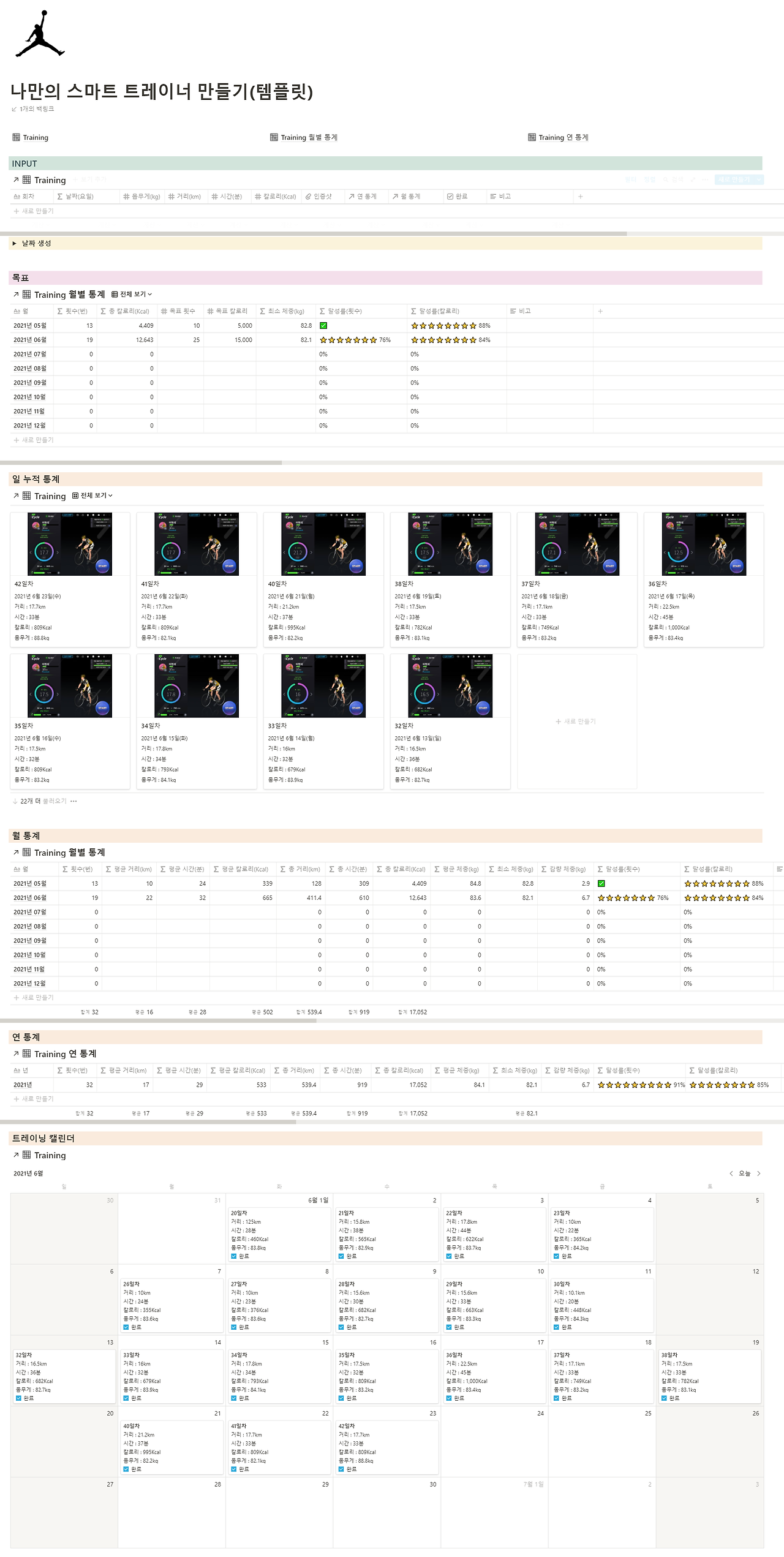저는 코로나 시국에 너무 운동을 안 해서 홈 트레이닝을 합니다. 집에서 사이클을 타는데 하루에 몇 분을 탔는지, 몇 km를 달렸는지, 몇 칼로리를 소모했는지 데이터를 쌓습니다. 한 달이 지나면 달 별로, 연 별로 누적 통계 데이터를 확인할 수 있는 페이지입니다.