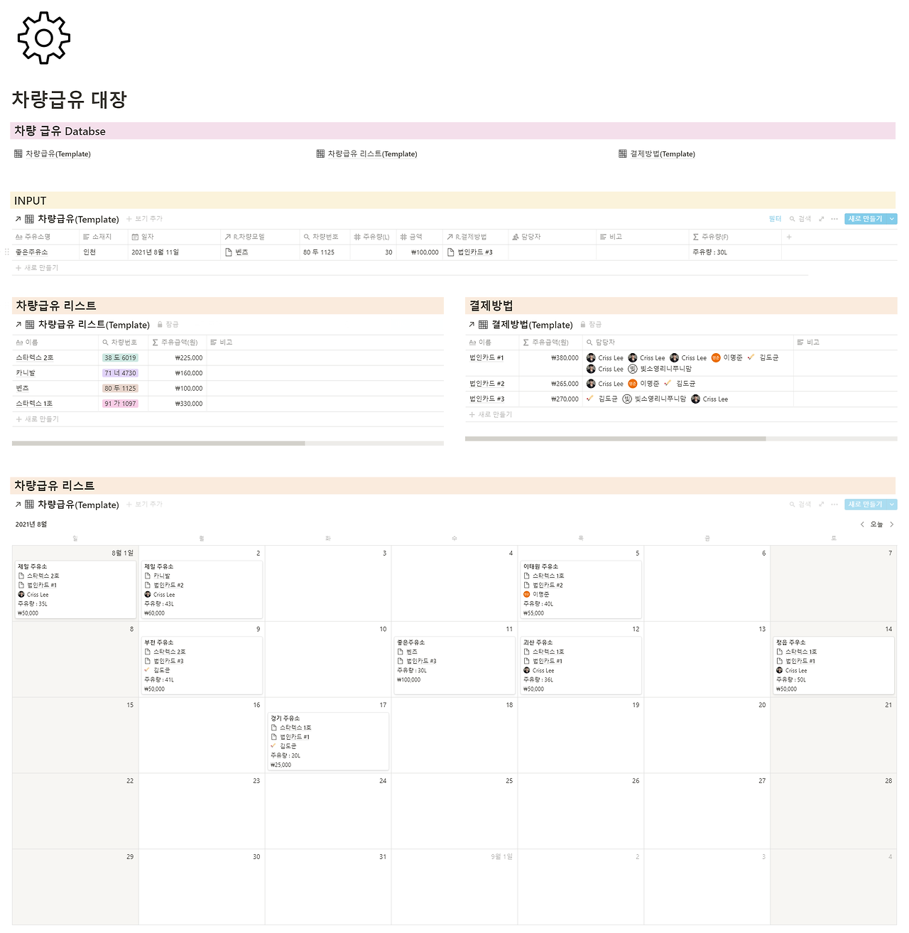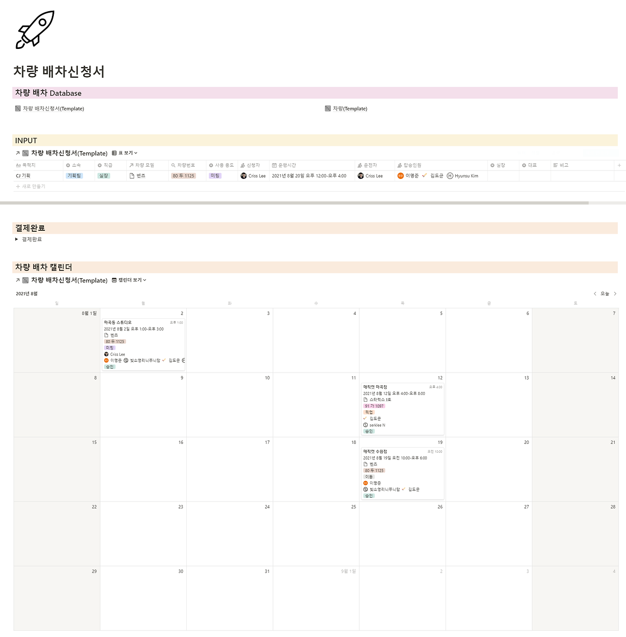 차량 배차를 신청하고, 승인하는 과정도 노션을 통해 쉽게 공유할 수 있습니다. 결제란을 만들어서 상급자가 확인하면 캘린더에 업데이트되도록 제작했습니다.