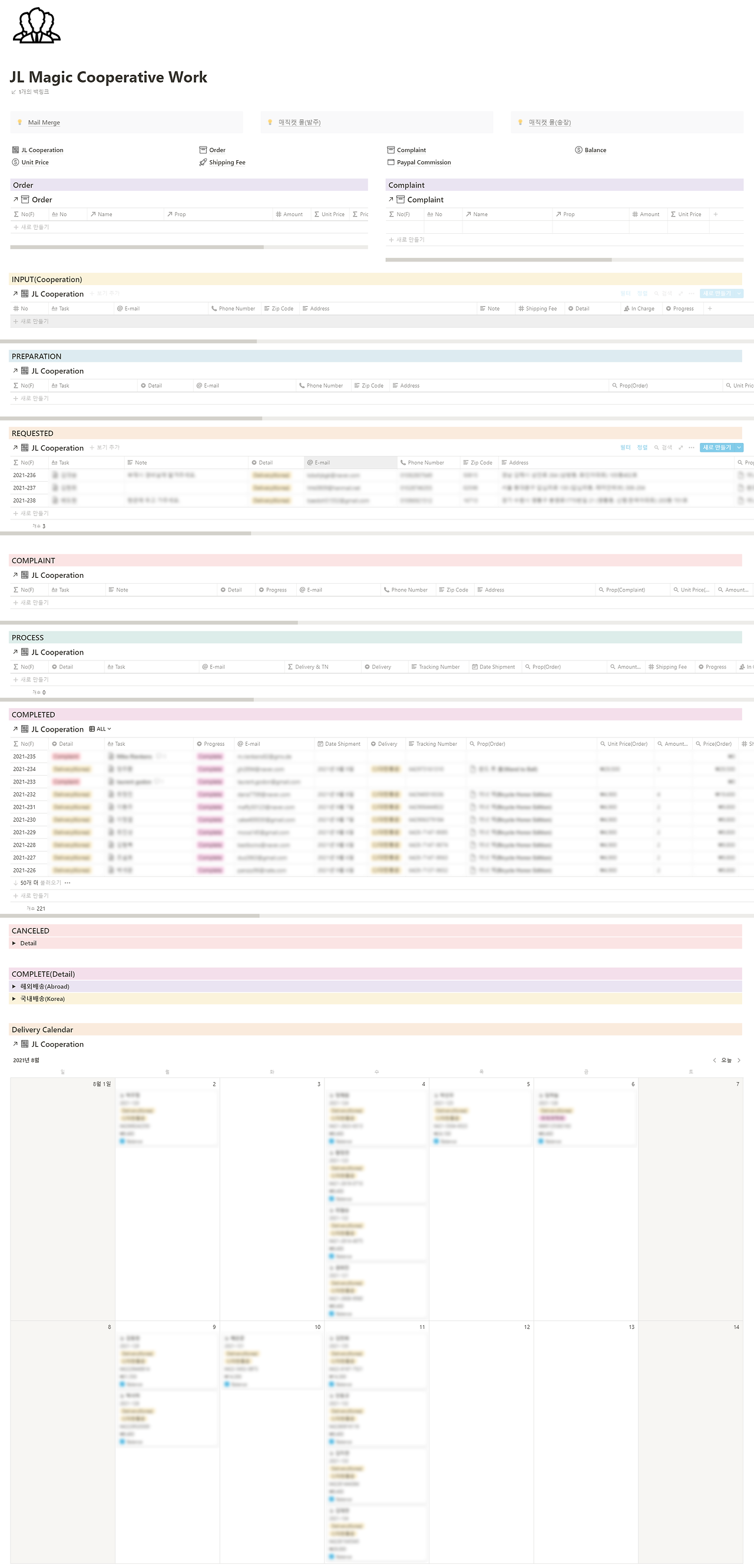 협업은 어떻게 하시나요? 넘겨도 넘겨도 끝이 없는 카톡으로 하시나요? 카톡을 업무에 활용하면 휘발성이 강합니다. 요청한 일을 찾으러 열심히 카톡창을 올려도 끝이 없습니다. 저희 회사는 매직캣 몰을 운영하고 있습니다. 하지만 배송은 하지 않습니다. 배송은 타 업체에서 전문으로 맡고 있습니다. 정확히는 위탁배송을 맡기는 셈입니다. 물건 배송 요청을 하고, 컴플레인 건을 처리하다 보면 카톡이 수두룩하게 쌓입니다. 그렇게 되면 실수로 이어집니다. 그래서 깔끔하게 협업하기 위해 제작한 페이지입니다.