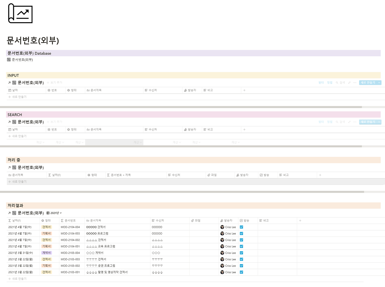 문서를 발송할 때 문서번호를 작성해야 합니다. 어디에 어떤 문서를 보냈는지 직관적으로 확인하고 관리할 수 있는 페이지입니다.
