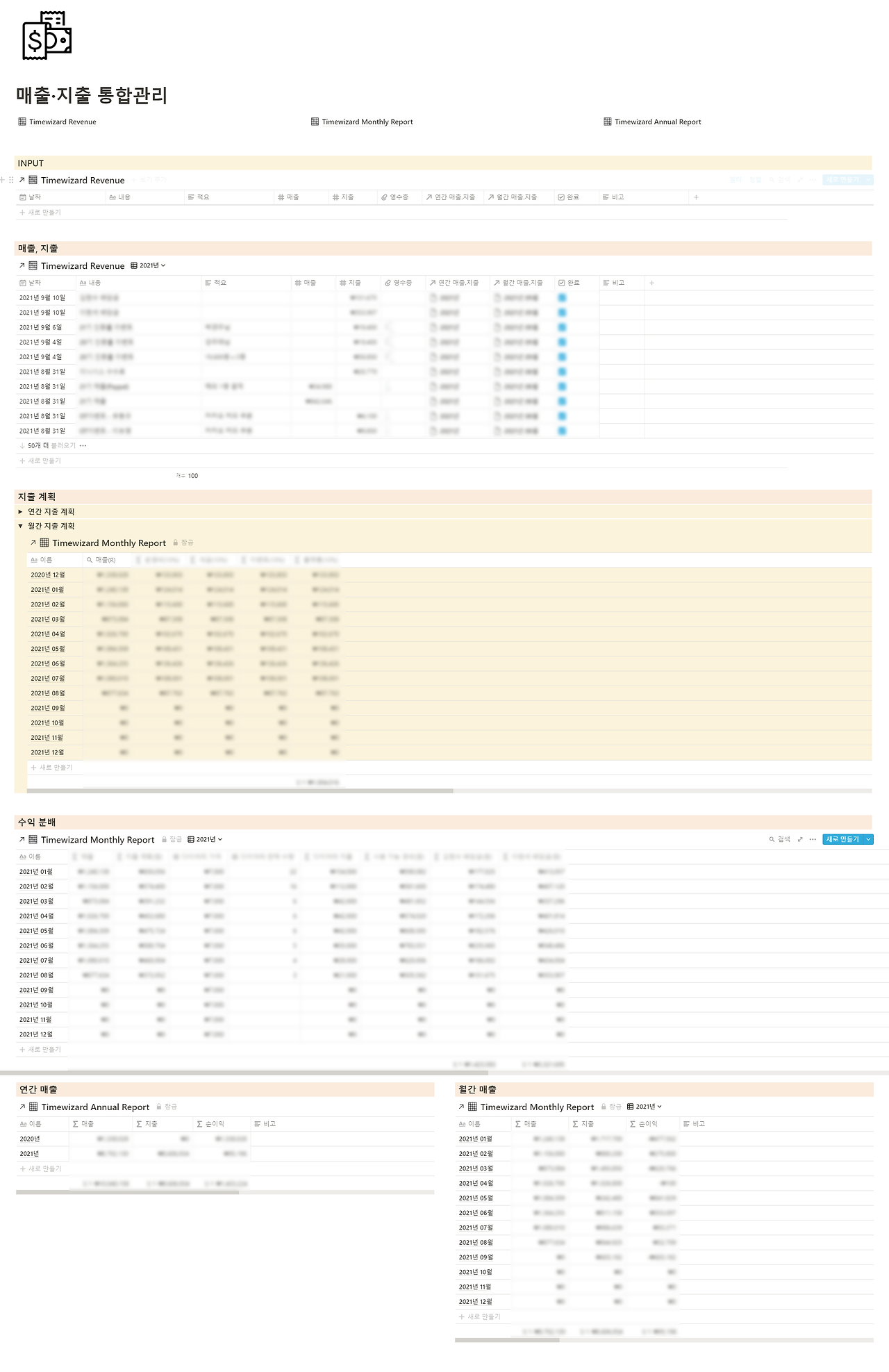 1인 창업을 했다면 매출과 매입을 관리해야겠죠? 여러 가지 편리한 프로그램이 있지만 노션으로 간편하게 관리할 수 있습니다. 여러 가지 뷰(View) 형태로 재목적화를 할 수 있어 직관적입니다.