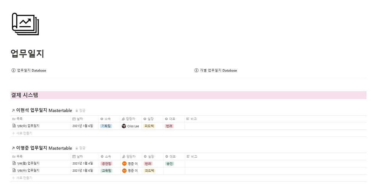 소기업을 운영하고 있다거나, 1인 기업을 운영하면서 업무일지를 작성하시나요? 템플릿을 지정해서 업무일지를 작성하고, 상급자가 결제를 할 수 있는 워크 솔루션을 노션으로 만들어서 사용하고 있습니다.