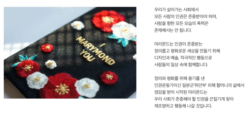 마리몬드의 브랜드 메시지는 일본군’위안부’ 피해자 할머니들로부터 영감을 받아 시작되었으며 할머니들의 이야기를 담은 플라워 패턴을 제작하고 해당 패턴들이 적용된 제품들을 판매하면서 소수의 고객들로부터 관심을 받기 시작하였다.