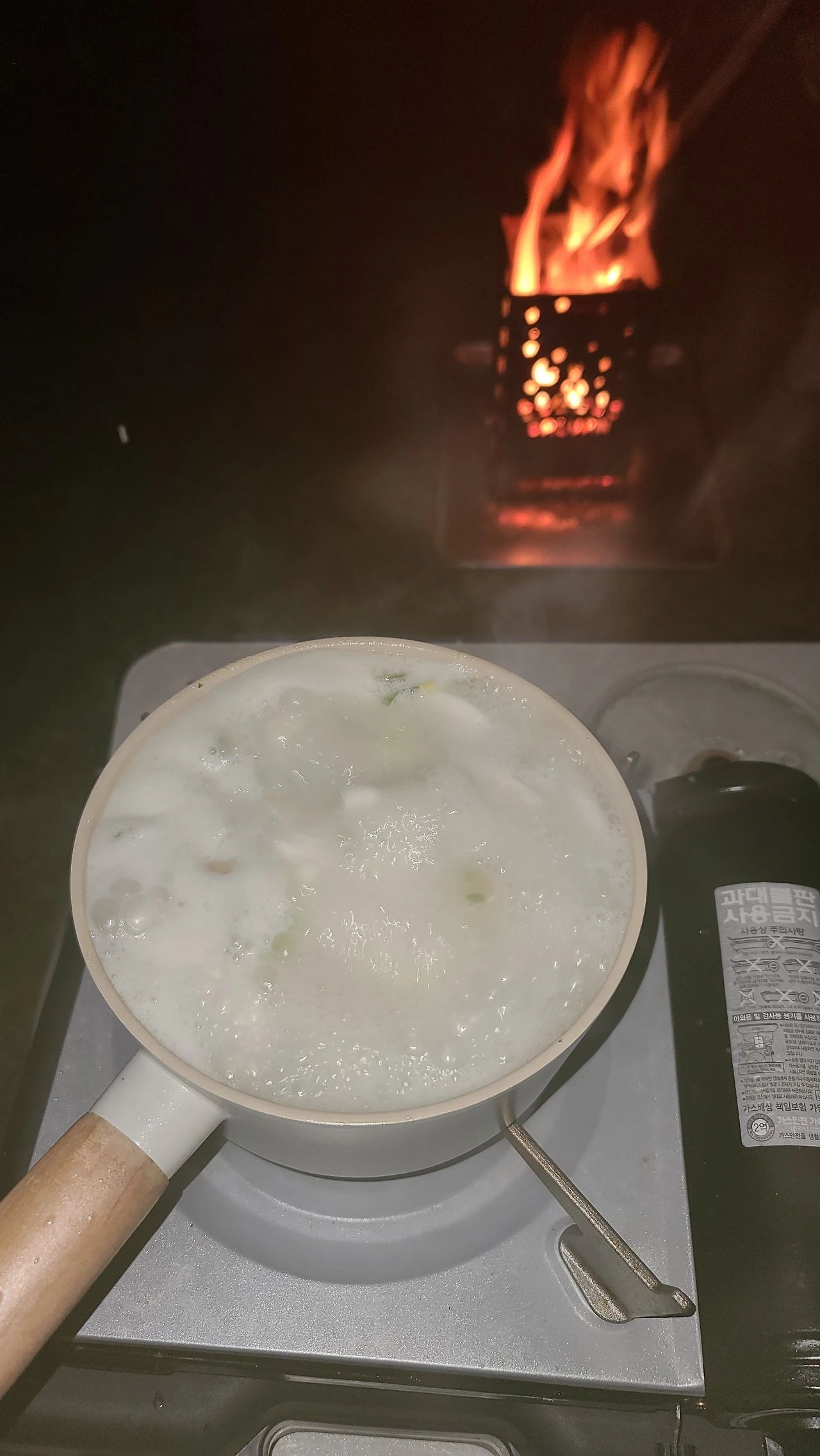 어둠이 깊어졌고, 바람이 차가워졌다. 우리에겐 손전등이나 조명이 없었다. 화로대의 불빛이 없었다면 저녁을 하는 것이 불가능한 상황. 난 불에 의존해 준비해 온 떡국 밀키트로 떡국을 끓였다. 2인분짜리였는데, 소식하는 우리 4인 식구에게 딱 맞는 양이었다. 우리는 국물 한 방울도 남기지 않고 싹싹 긁어 다 먹었다.
