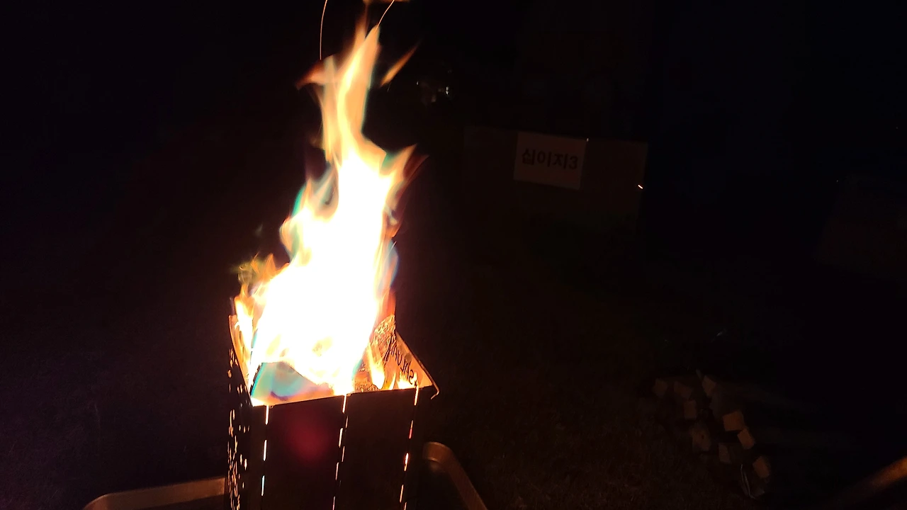 여전히 캠핑 초보인 나는 큰 걸 하지 않기로 했다. 이번에도 당일 캠핑이다. 텐트를 친다고 해도 추위를 피하는 용도가 될 것이 뻔했다. 그러나 작은 도전을 해보기로 했다. 요즘같이 추운 날에 좋은 불멍. 나는 소형 불멍 화로대를 샀다. 4인 가족이 나란히 붙어 앉아 손을 쬐기 좋은 크기였다. 오로라 가루가 서비스였는데, 장작이 탈 때 넣으면 불꽃이 총천연 무지개색으로 살아나는 가루였다.