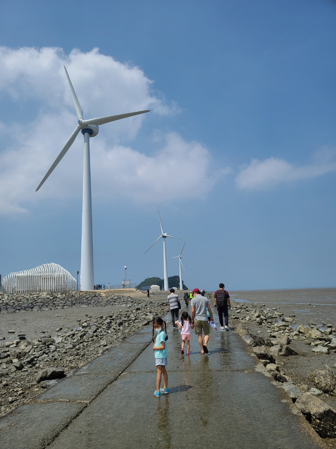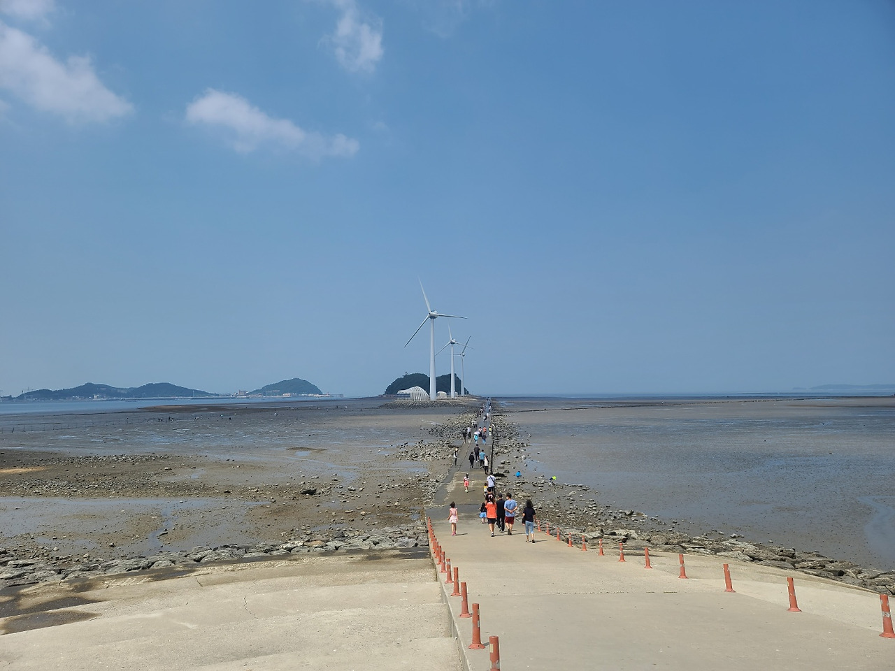다음은 점심을 먹어야할 차례. 주차장에 차를 간신히 대고 온 터라 차박 풍경으로 적합한지 여부를 따질 겨를이 없었는데, 아니나 다를까 바닷가가 펼쳐지리라는 기대와 달리, 앞에는 넓은 갯벌만이 펼쳐졌다. 우리 차 주변에는 여기저기 빈 병이 나뒹굴었고, 잡초가 무성했다. 게다가 바람이 왜 이리 부는지. 풍력발전을 한다고 할 때 이미 알아봐야했었다. 차박을 계획하고 왔지만 우리는 트렁크를 열어놓고 앞에 펼쳐진 풍경을 보는 것은 포기했다. 앞의 풍경은 삭막하기 그지 없었다. 메마른 바닥에 돌덩이가 가득했다.