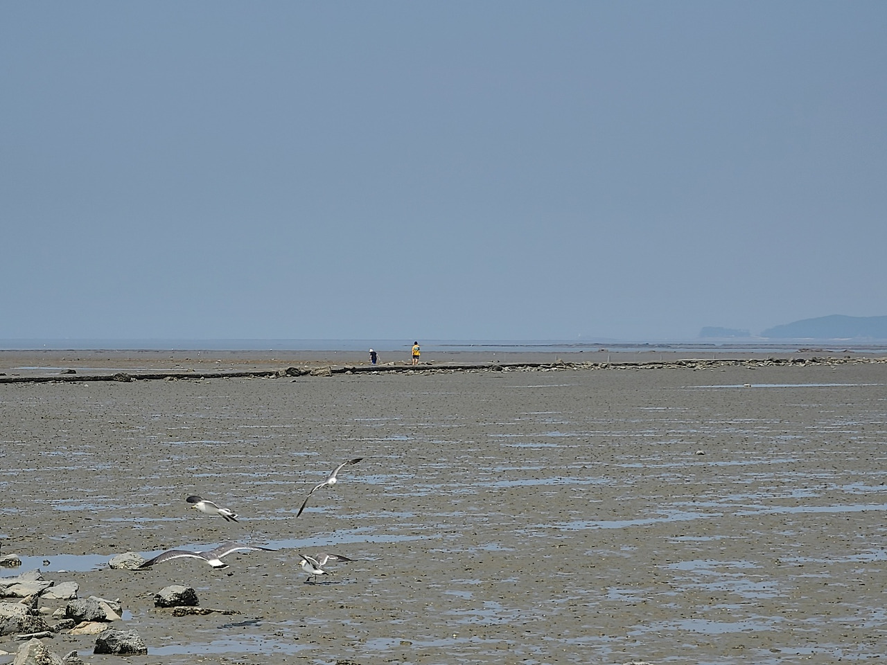 옆에는 장화를 신고 갯벌놀이를 하는 이들이 있었다. 다소 깔끔하고 까칠한 딸들은 '저런걸 구태여 왜하냐?"는 표정으로 쳐다봤다. 사실, 그건 내가 생각해도 오늘같이 불쾌지수가 높은 날에 썩 좋은 놀이는 아니었다.