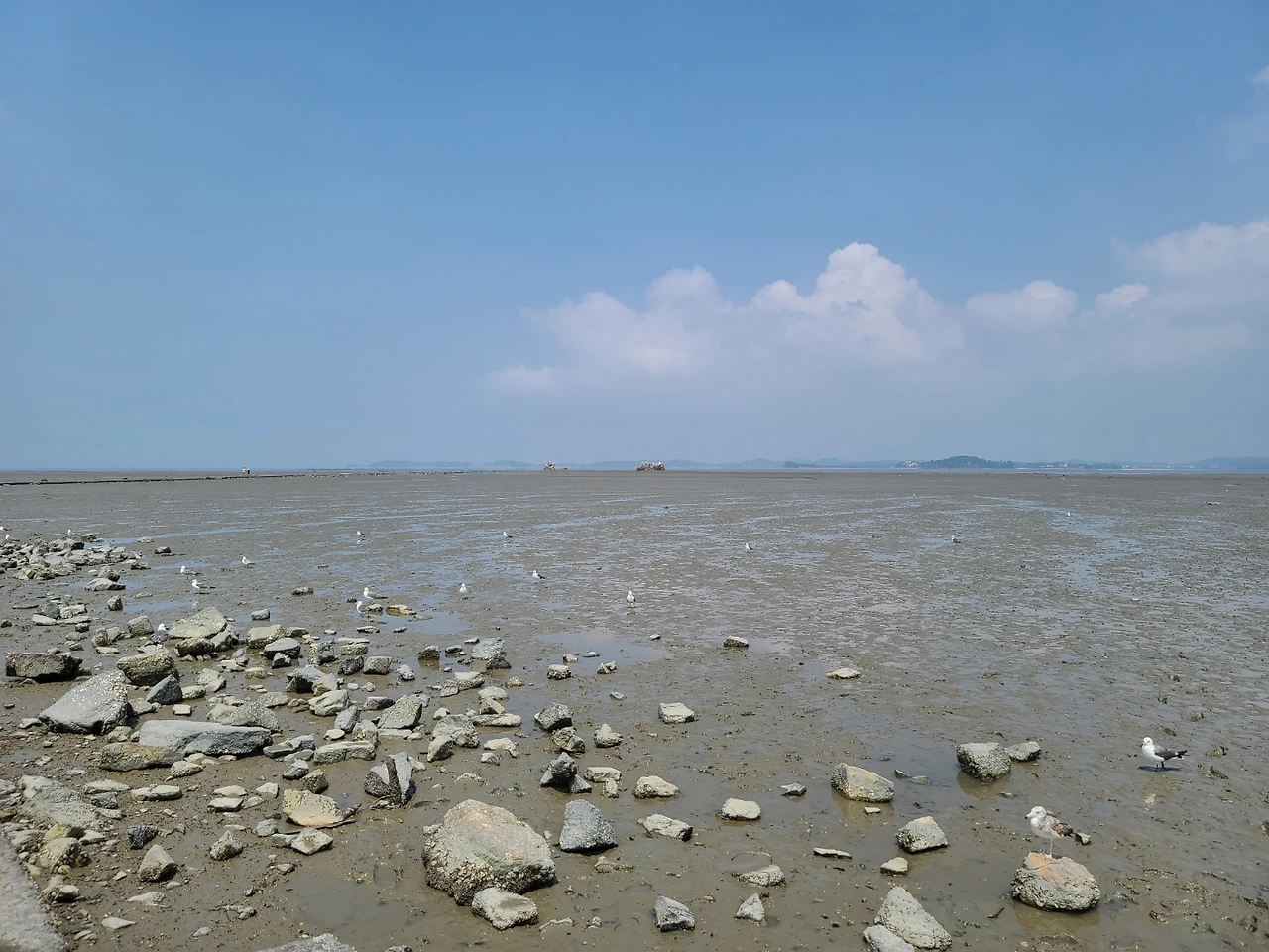 아이들의 시선은 이내 갯벌 주위의 갈매기들에게 향했다. 근처에는 더위를 식혀줄 아이스크림과 갈매기들에게 줄 새우깡을 파는 마트가 있었다. 아이스크림을 먹고 나서, 신랑이 더위로 인한 불쾌지수를 다스리는 동안 아이들과 나는 새우깡을 사서 갈매기들에게로 향했다.