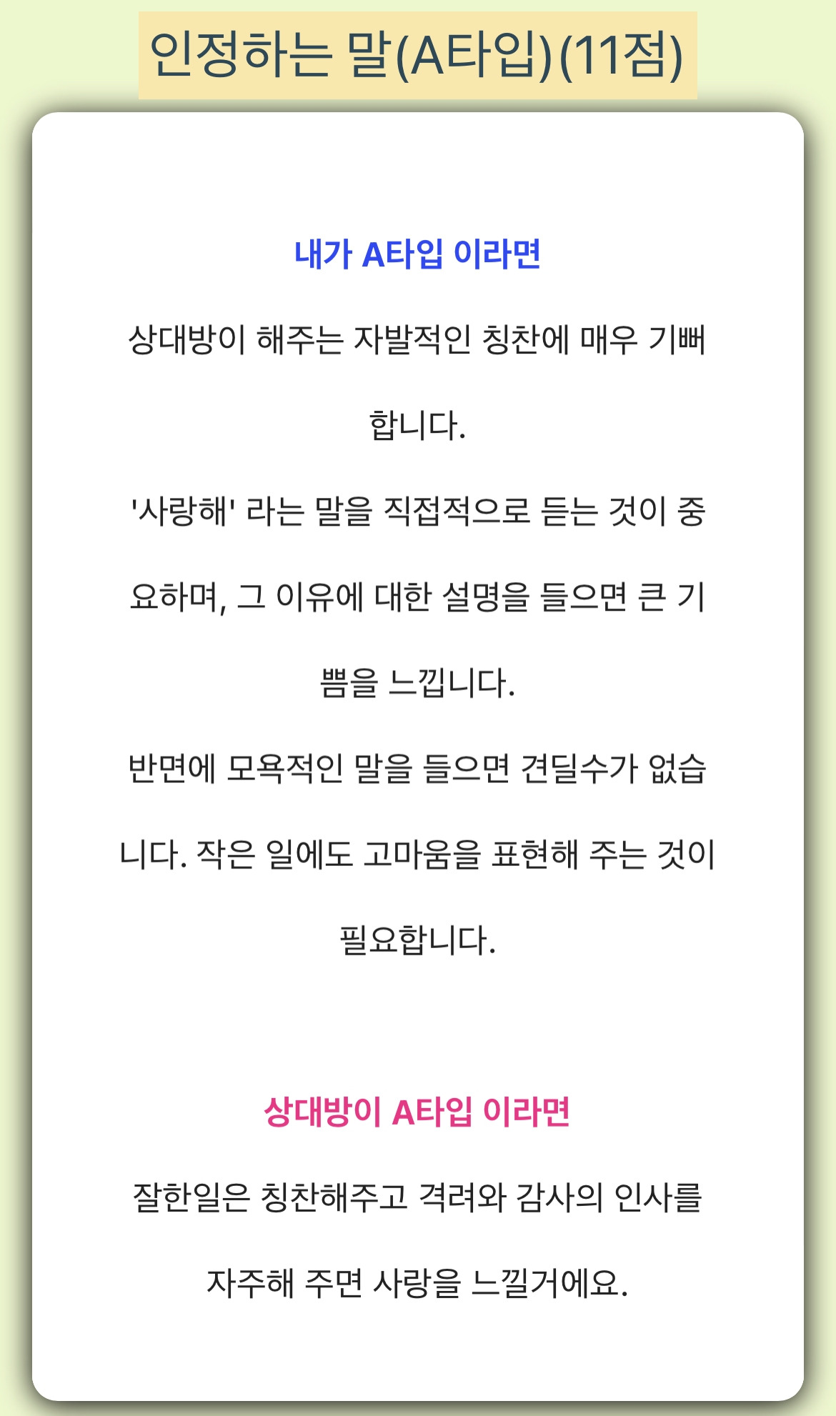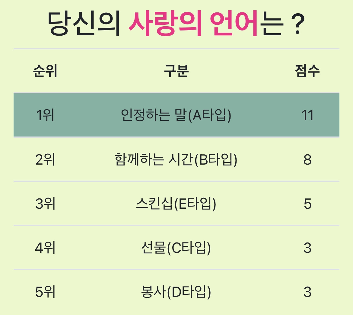 나는 내 짝이 나를 인정해 주는 것을 가장 사랑으로 느낀다(1위). 그런데 이게 그녀의 꼴등 순위이다.