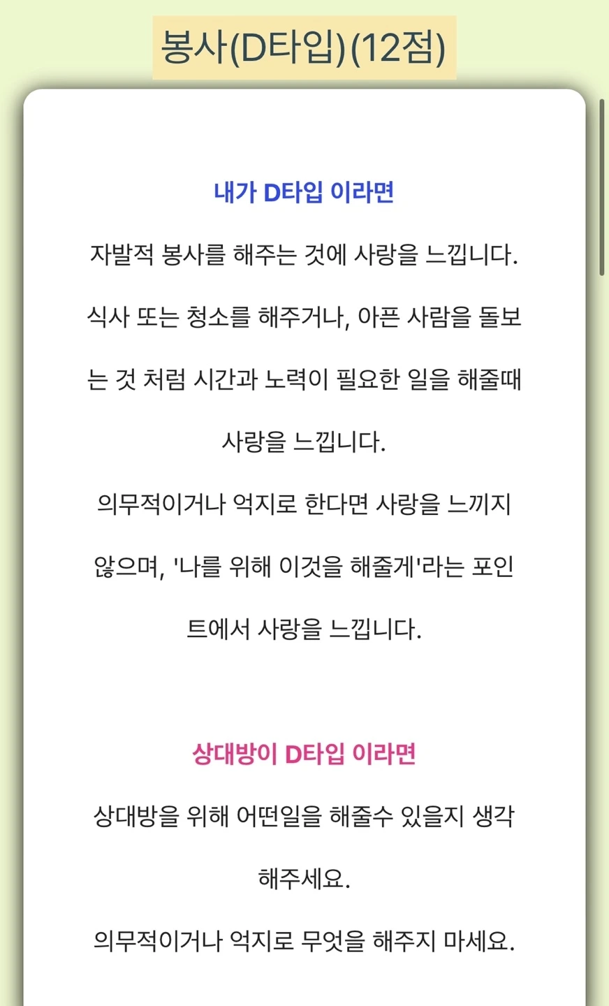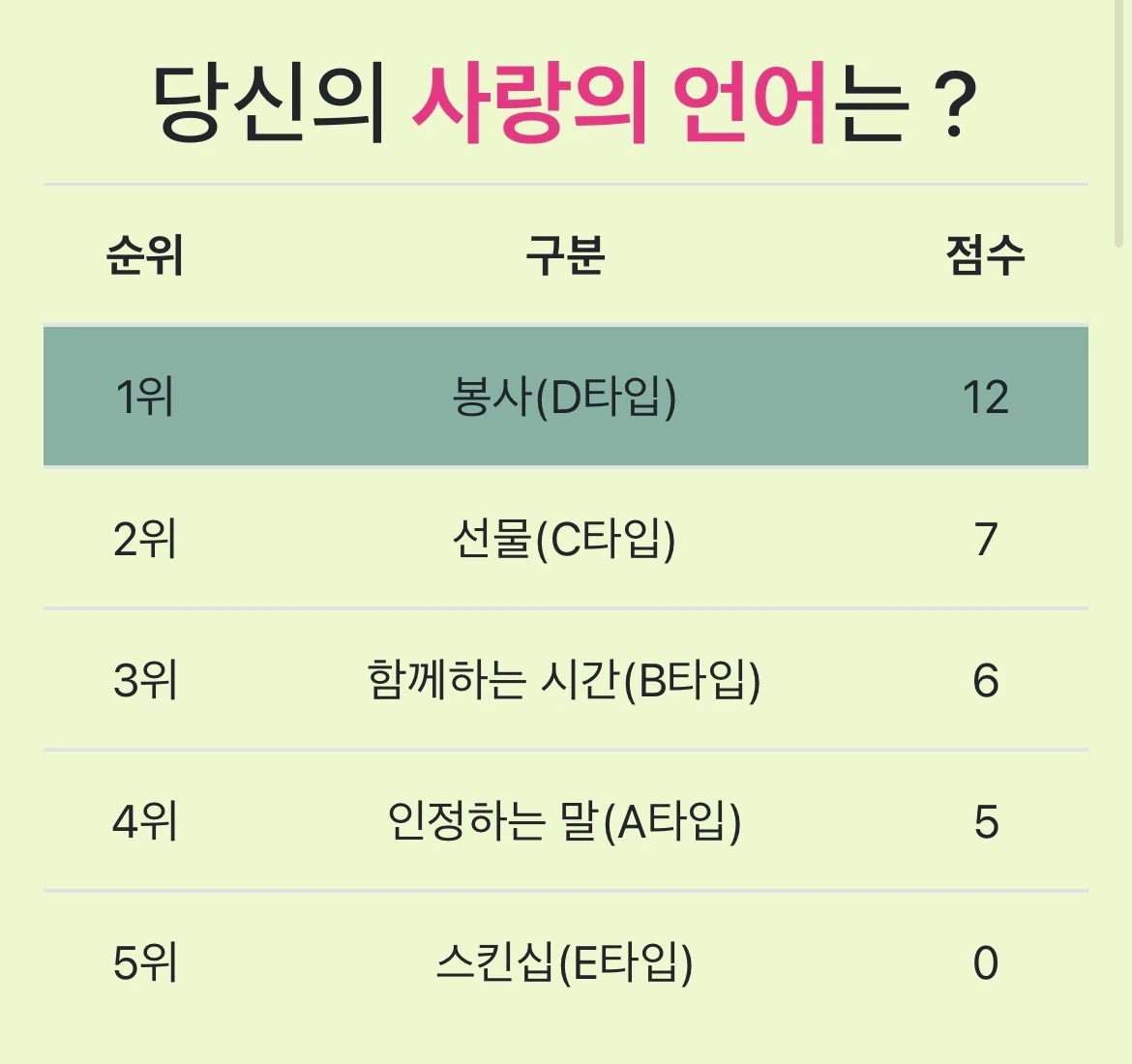 그녀의 1위로 나온 봉사 항목은, 본인이 하기 싫은 일을 해주는 것에 가장 큰 사랑을 느끼는 것인데 이건 또 나의 꼴등이다.