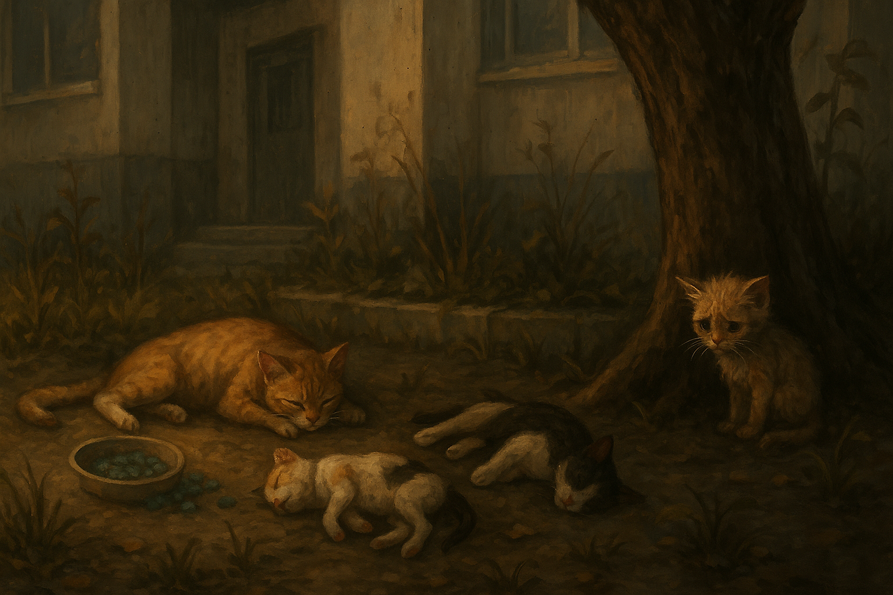 고양이 세 마리가 입에 거품을 물고 쓰러져 있었고,
