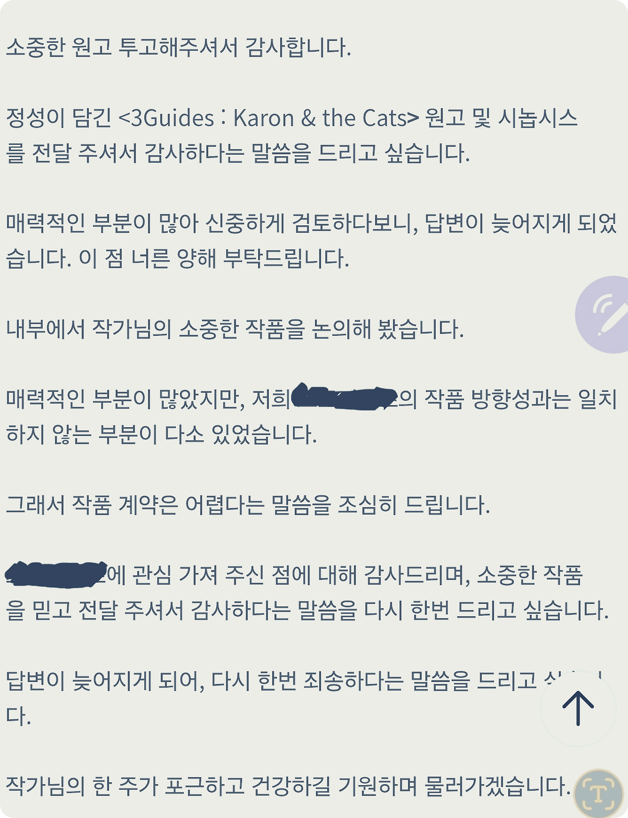비록 작품 방향성 차이로 계약은 성사되지 못했지만, 저에게는 큰 힘이 되었습니다.