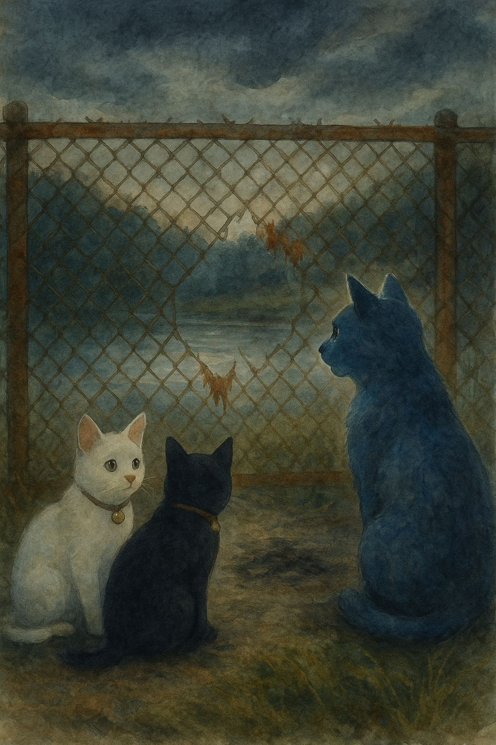 철망 너머로 넓은 시냇물이 흐르고 있었어요. 철망 앞 공터엔 흰색 고양이 털이 여기저기 흩어져 있고, 핏자국 같은 얼룩도 보였죠.