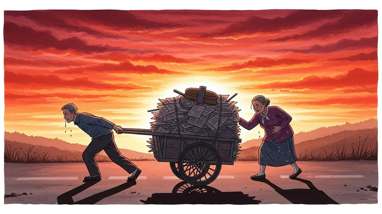 노부부는 고물상에 폐지와 고철을 내려놓고, 빈 리어카를 끌고 달동네를 올라왔습니다.