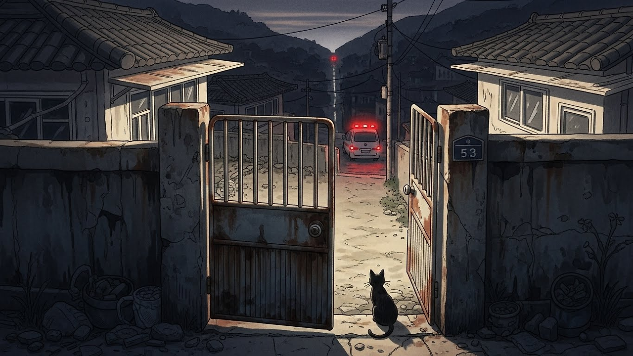 텅 빈 마당, 활짝 열린 대문 앞에 홀로 남은 깜숙이가 멀어져 가는 구급차 꽁무니를 하염없이 바라보며 구슬프게 울었습니다.