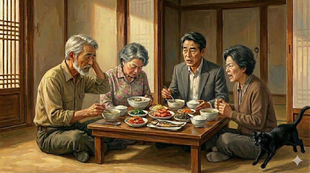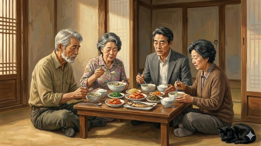 잠시 후, 온 가족이 밥상에 둘러앉았습니다.