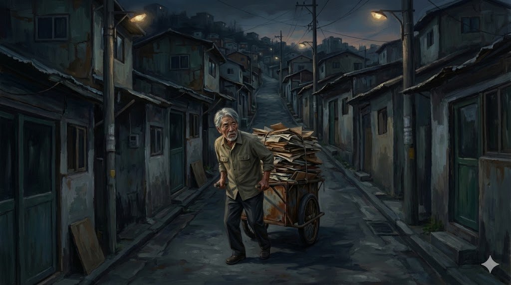 그는 습관처럼 옷을 챙겨 입고 밖으로 나와 차가운 새벽 공기를 가르며 리어카를 끌었습니다.