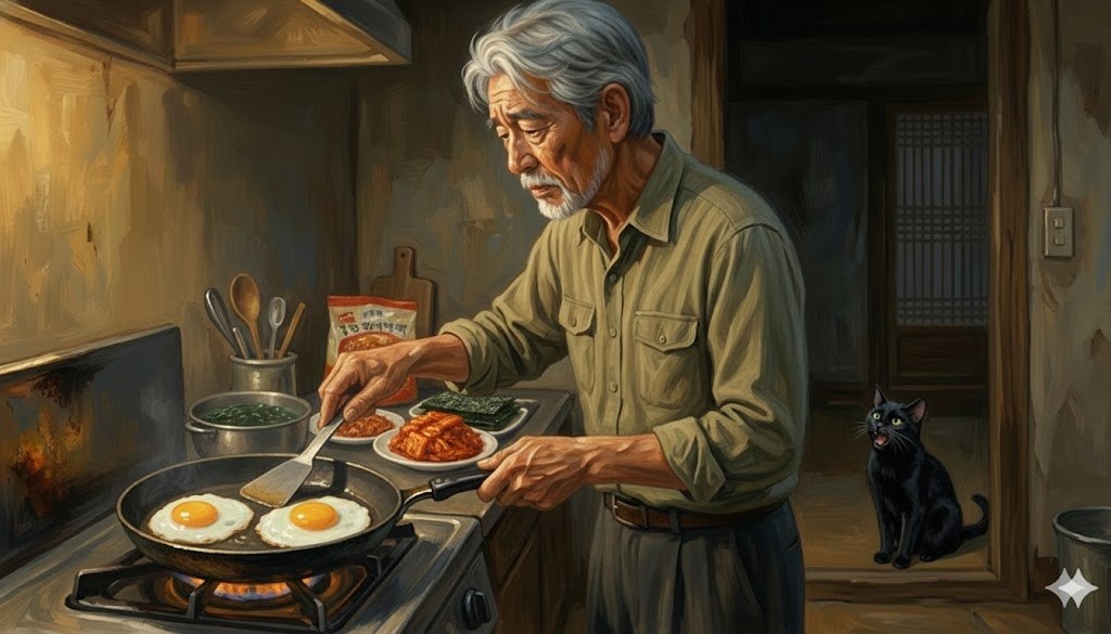 그는 서둘러 주방으로 들어가, 어제 남은 미역국을 데우고 계란 프라이를 부치고, 고물상 주인이 준 김 봉지를 뜯고, 냉장고 깊숙이 들어 있던 묵은지를 꺼내 작게 썰어 접시에 담았습니다.