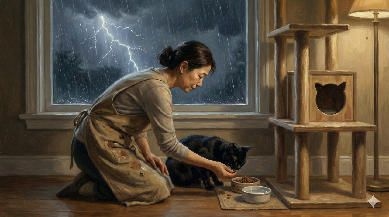 그녀는 캣타워 아래 사료 그릇에 갈색 알갱이들을 가득 부어주었다. 물그릇도 깨끗하게 닦아 시원한 물로 갈아주자 깜탄이가 협탁에서 폴짝 뛰어내려 꼬리를 바짝 세우고 사료를 오독오독 씹기 시작했다.
