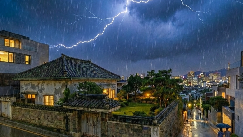 예고에도 없던 폭우가 성북동의 낡은 지붕 위로 사정없이 쏟아지기 시작했다.