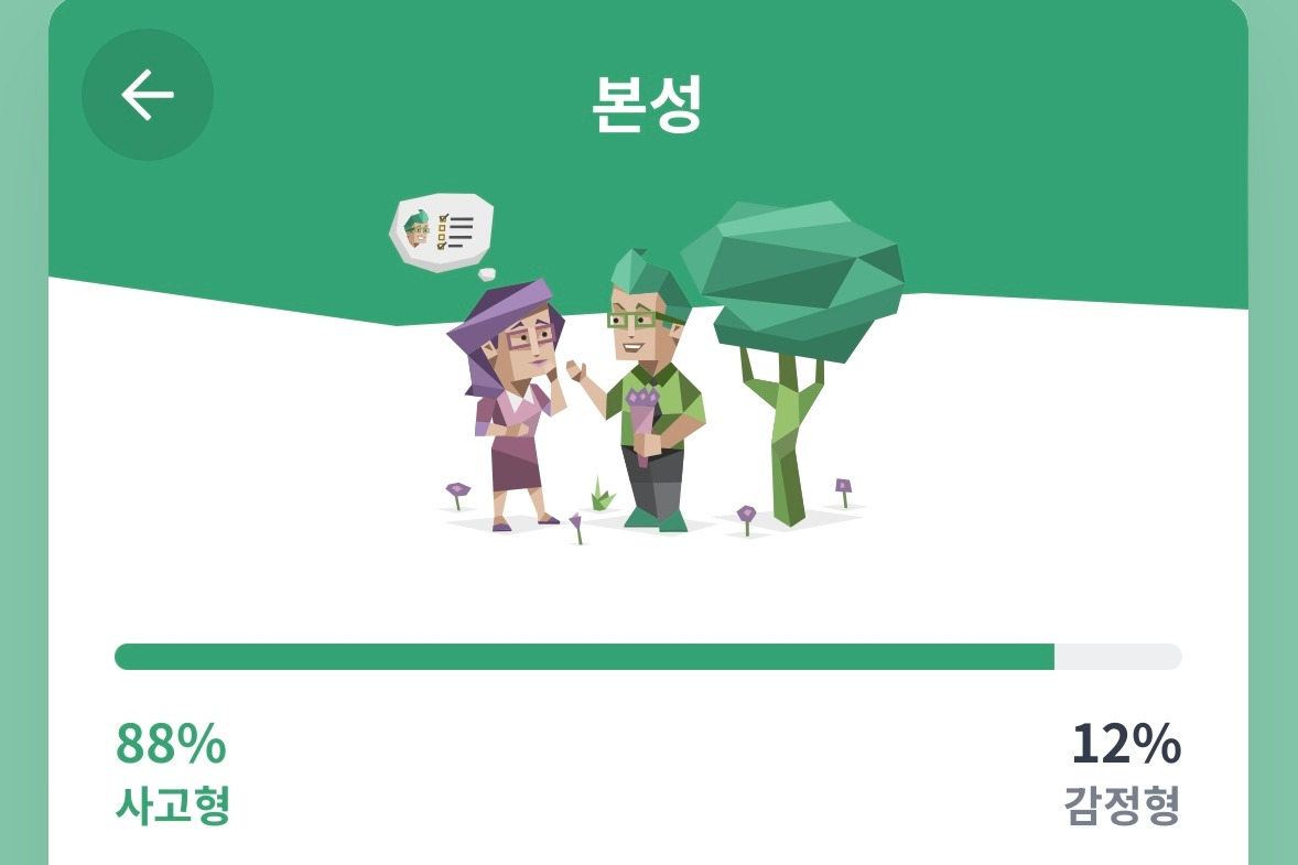 그 후 한동안 잊고 있었는데 몇 년 전 MBTI 열풍이 불었고 나의 MBTI를 묻는 회사 동료들에게 ESNTJ라고 말했다. 인터넷에서 클릭하는 유형의 테스트를 해보라는 말에 휴대폰을 켜서 해보니 INTJ가 나왔다. 재미 삼아 그 후로도 수 차례 했는데 ISTJ와 INTJ가 번갈아서 나온다. 밖에 나가 놀기 좋아했던 대학 시절과는 반대로 집순이가 되었기에 E에서 I가 된 건 몹시 공감한다. S와 N이 동점이라 테스트하는 날의 상태에 따라 번갈아서 나오는 것 역시 이해된다. TJ 성향은 예전이나 지금이나 같고 아마도 죽는 날까지 그러하리라 생각한다.
