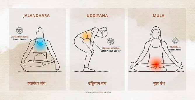 가장 먼저 이야기 한 뮬라 반다는, 몸통 바닥 방향 회음부 근육을 수축하고 들어올리는 움직임이다. 온 몸의 뿌리가 되는 부분에서 에너지가 바깥으로 나가지 않도록 잡아둘 수 있을 것이다. 우디야나 반다는 복부 근육을 사용하여, 횡격막을 가슴 위쪽으로 들어올리는 자세를 말한다. 강한 복부 수축과 유사하다. 잘란다라 반다는 목구멍 에너지 잠금 이라고 이해하면 된다. 목을 구부리고 턱을 가슴 가까이 오도록 하는 것이다.