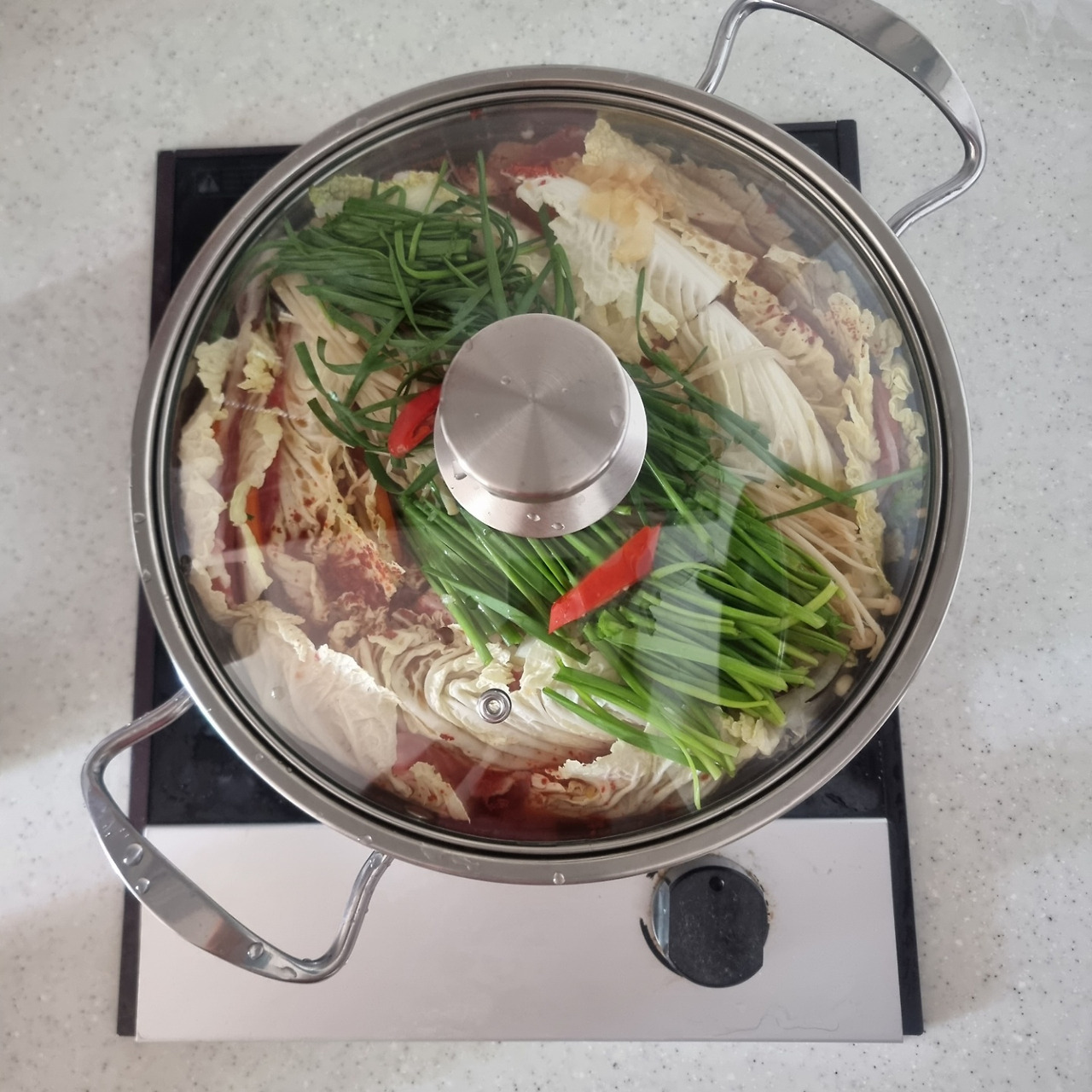 처음은 배추 손질이 필요했다. 배추 아랫부분을 잘라내고 한 겹 한 겹 떼어내며 이파리 사이사이를 씻어 말렸다. 우삼겹도 잠시 상온에 꺼내놓는다. 돌돌 말린 모양으로 얼려져 있었기 때문에 배추 사이에 껴놓으려면 시간이 좀 필요하다. 양파와 당근도 꺼낸다. 당근을 좀 길게 타원형으로 썰어둔다. 씻은 배추를 먼저 펴 놓고, 그 위에 당근과 우삼겹을 펼쳐본다. 우삼겹은 많으면 더 맛있으니, 한 줄이 아니라 두 줄로 넣어둔다. 차곡차곡 배추 위로 계속 재료들을 쌓았다. 그렇게 납작한 냄비에 가득 채울만한 수준이 되면 멈춘다. 중간에 잠시 틈을 만들어 양파와 팽이버섯을 넣는다. 그 위엔 부추와 고추도 올려놓는다.