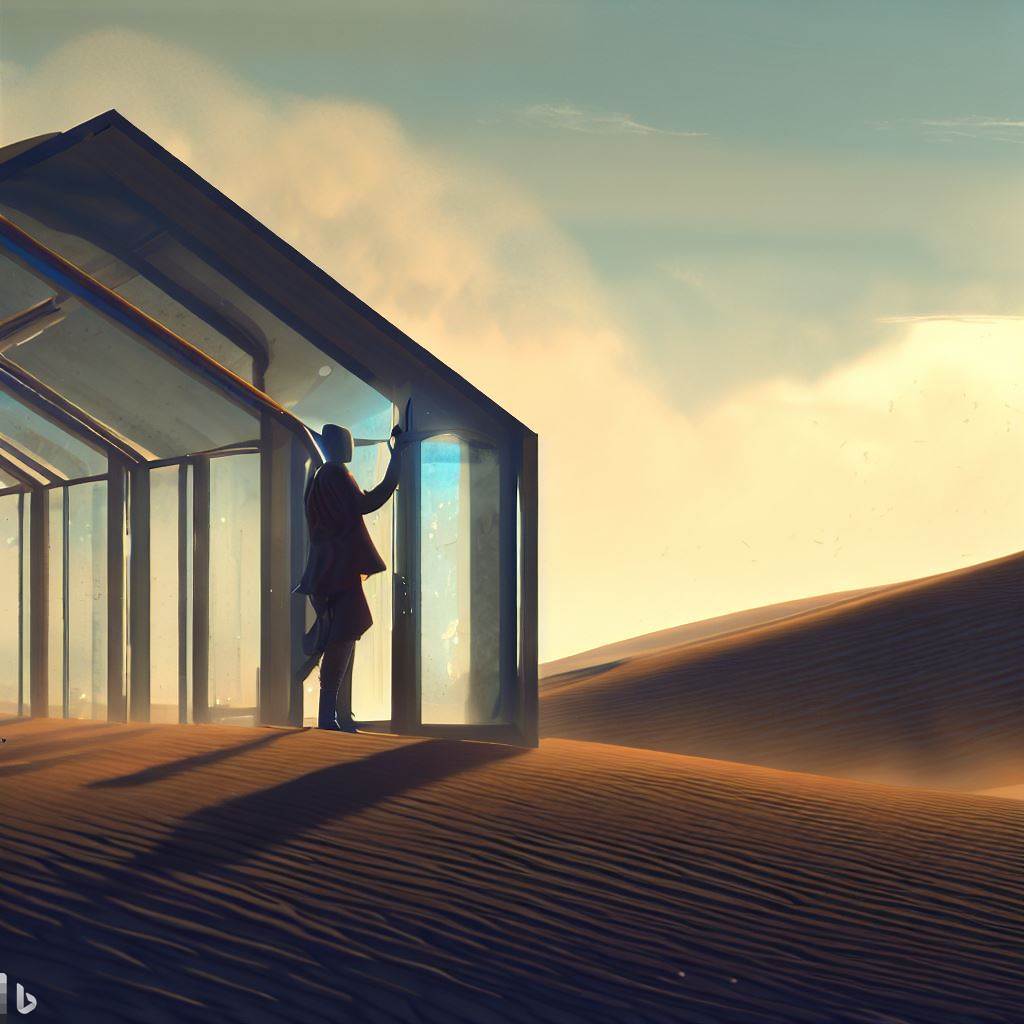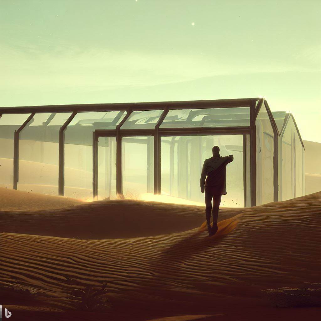 “드디어 모래바람이 부는 사막 속에서 하나의 작고 깔끔한 쉼터를 발견했다. 그 쉼터는 유리로 되어있었는데, 바깥바람이 들어오지 않게 몇 겹의 문이 있었다. 거센 모래바람 속에서도 무너지지 않기 위해 낮은 층으로 지어진 건물이었는데 결코 좁지 않았다. 나는 그 문을 통과하고 들어가 드디어 내가 쓰고 있던 나만의 마스크를 던져버리고는 큰 호흡으로 쉼터 속 맑은 공기를 크게 들이마셨다.”
