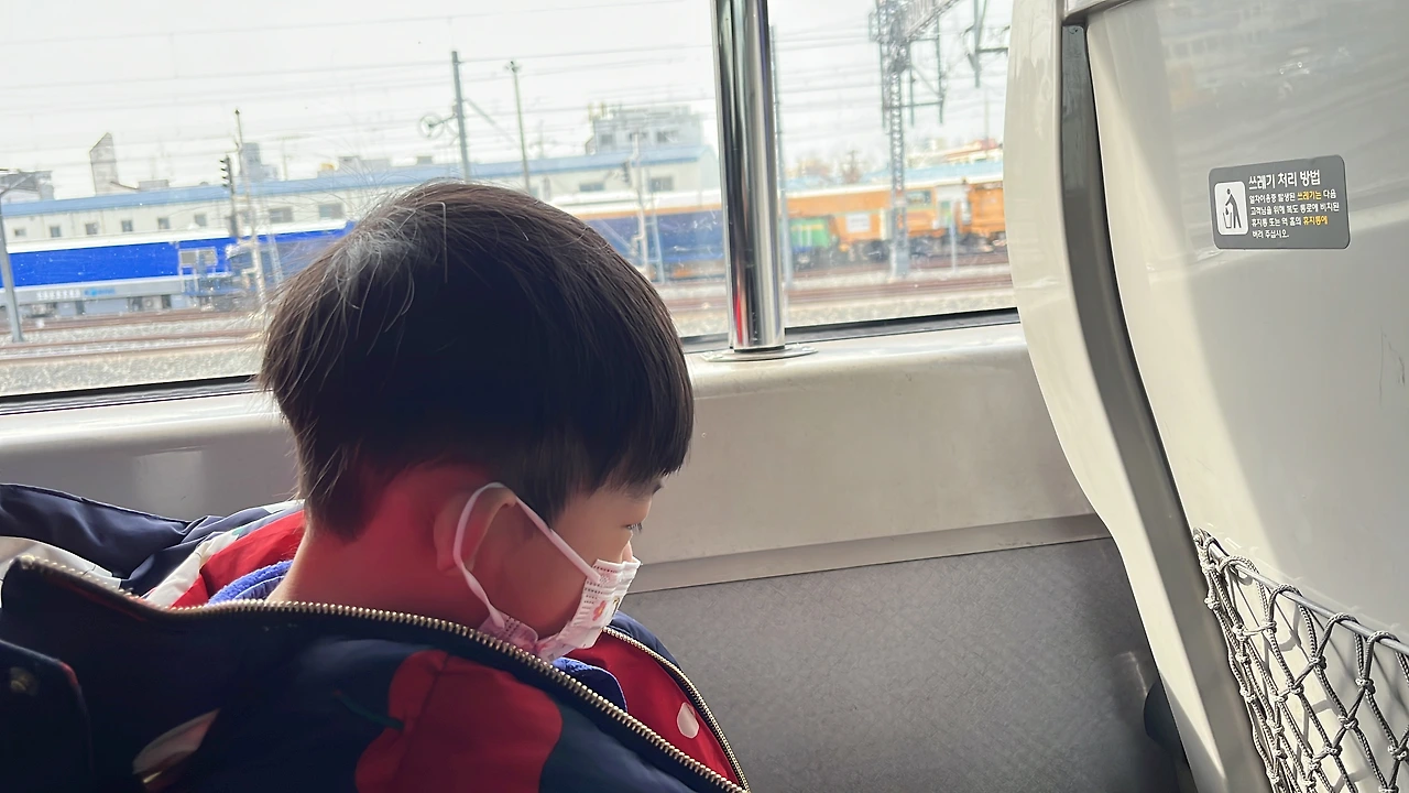 자리에 앉자마자 겹겹이 챙겨 입은 옷부터 벗었다. 엄청 춥다고 해서 껴입고 나왔는데 우주만 한 가방과 우주를 들고 다니면 추위를 느낄 틈이 없다. 터널을 지나 지상으로 나오니 어제 내린 눈으로 온 세상이 하얘져있었다. 나는 바깥 풍경을 보고 싶고 우주는 커튼을 올렸다 내렸다 가지고 놀고 싶어 했다. 적절히 중간쯤에서 타협을 보기로 했다. 아침을 먹는 둥 마는 둥 했던 우주는 과자를 달라 외쳤고, 그럴 줄 알고 간식 가방을 따로 빼둔 나를 대견해하며 과자와 주스를 줬다.