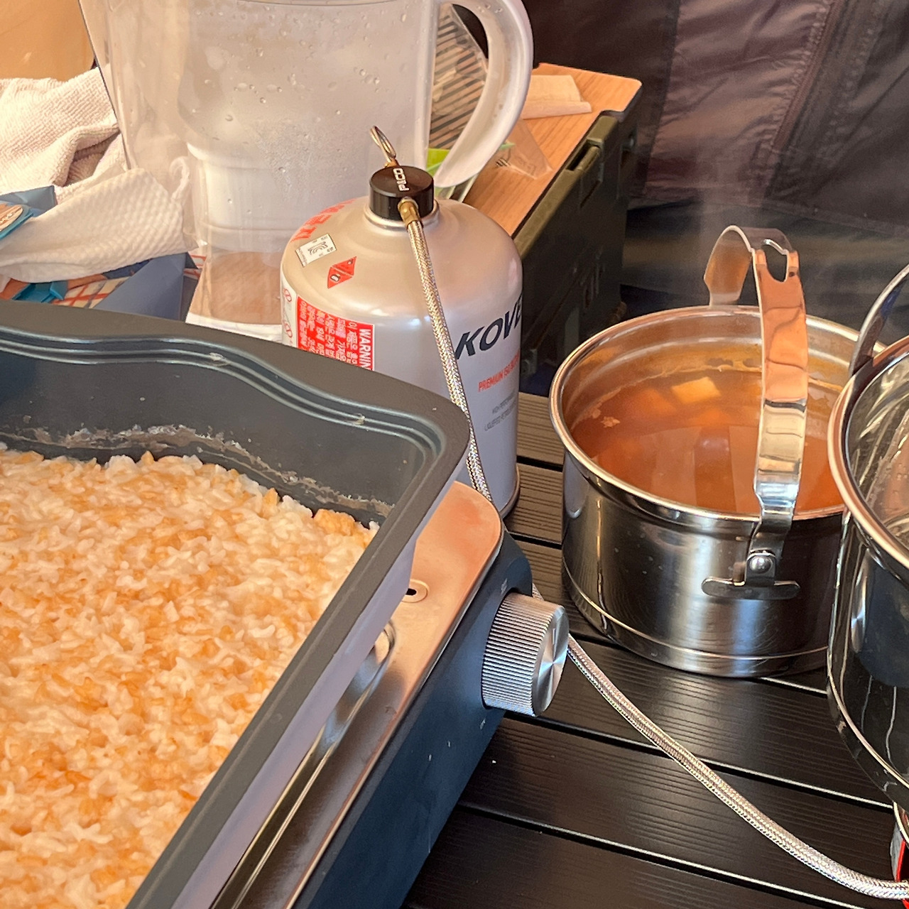 맵거나 너무 짜면 아이에게 먹일 수가 없어 밀키트 대신 집에서 재료를 챙겨 요리해 먹는다. 롤테이블 앞에 앉아 얇은 도마 위에서 경쾌한 소리를 내며 하는 칼질도 재미가 쏠쏠하다. 첫날 저녁은 텐트 피칭 후에 정신없을 것 같아서 제육을 재워왔다. 우리는 고추장, 아이는 간장으로. 텐트 정리를 마치고 불판에 재운 고기를 올리기만 하면 되어서 정말 편했다.