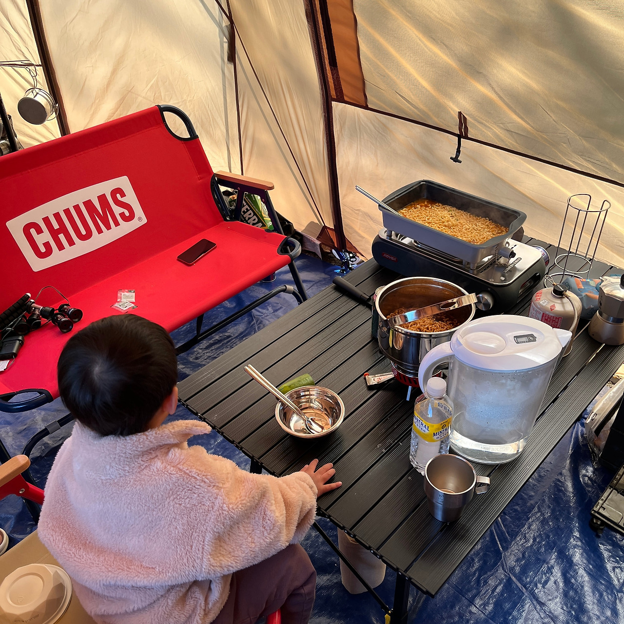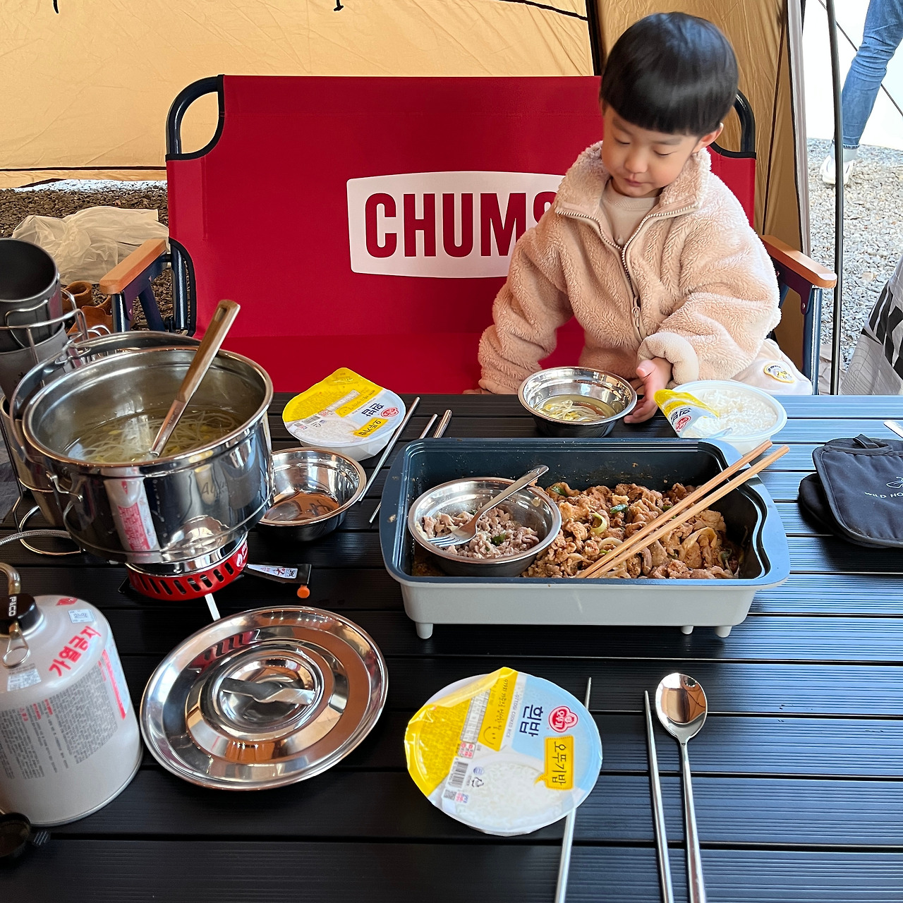 우리 캠핑의 식사 메뉴는 거의 고정이다. 아침은 된장찌개와 누룽지, 저녁은 삼겹살. 아침에 먹는 누룽지에 된장찌개는 속을 편안하게 하고 마음을 따뜻하게 한다. 저녁에 먹는 삼겹살은 그간 아이 때문에 참아왔던 굽는 고기를 향한 갈망을 완전히 해갈해 준다. 점심에는 면 파티를 벌였다. 아이는 생애 첫 짜파게티로 행복한 식사시간을 보냈다.