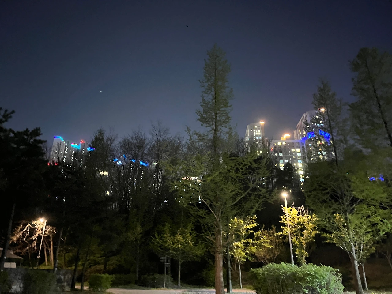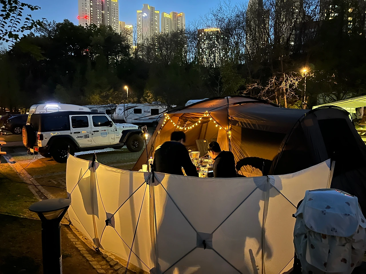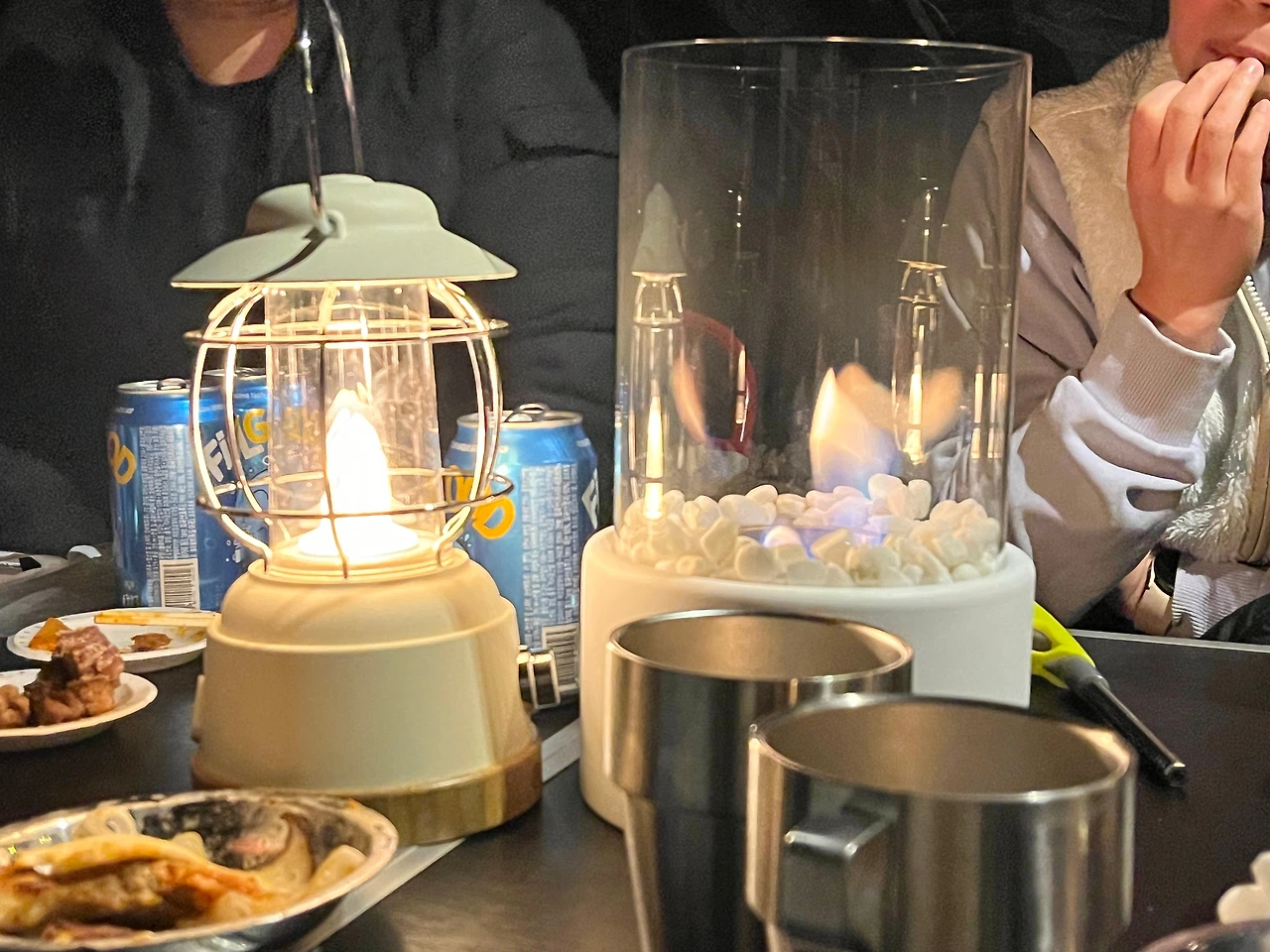 한쪽은 대로, 한쪽은 아파트로 둘러싸인 찐 도심 속 캠핑장에 어둠이 내리기 시작했을 때 고기파티를 시작했다. 친구가 푸짐하게 사 온 고기를 먹고 먹고 또 먹었다. 크리스마스트리에서 떼왔다는 전구도 켜주니 정말 파티 같았다. 9시 가까이 되니 너무 추워서 바깥 테이블을 철수하고 텐트로 들어갔다.