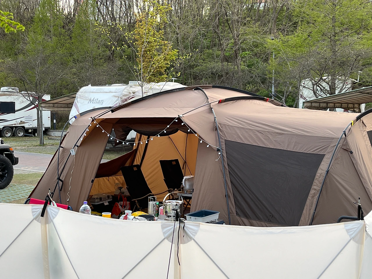 강풍과 더불어 사이트가 비좁아서 주차 자리까지 먹고 텐트를 치려니 보도블록 사이에 맞춰 팩을 박는 일이 여간 까다로운 게 아니었다. 박아야 할 곳에 박지 못한 데다가 자리마다 단차가 생겨서 결국 텐트가 좀 팽팽해지기는 했는데... 그래도 펄럭펄럭 느슨한 것보다야 잘 된 것 아니겠냐며 스스로를 위로했다.