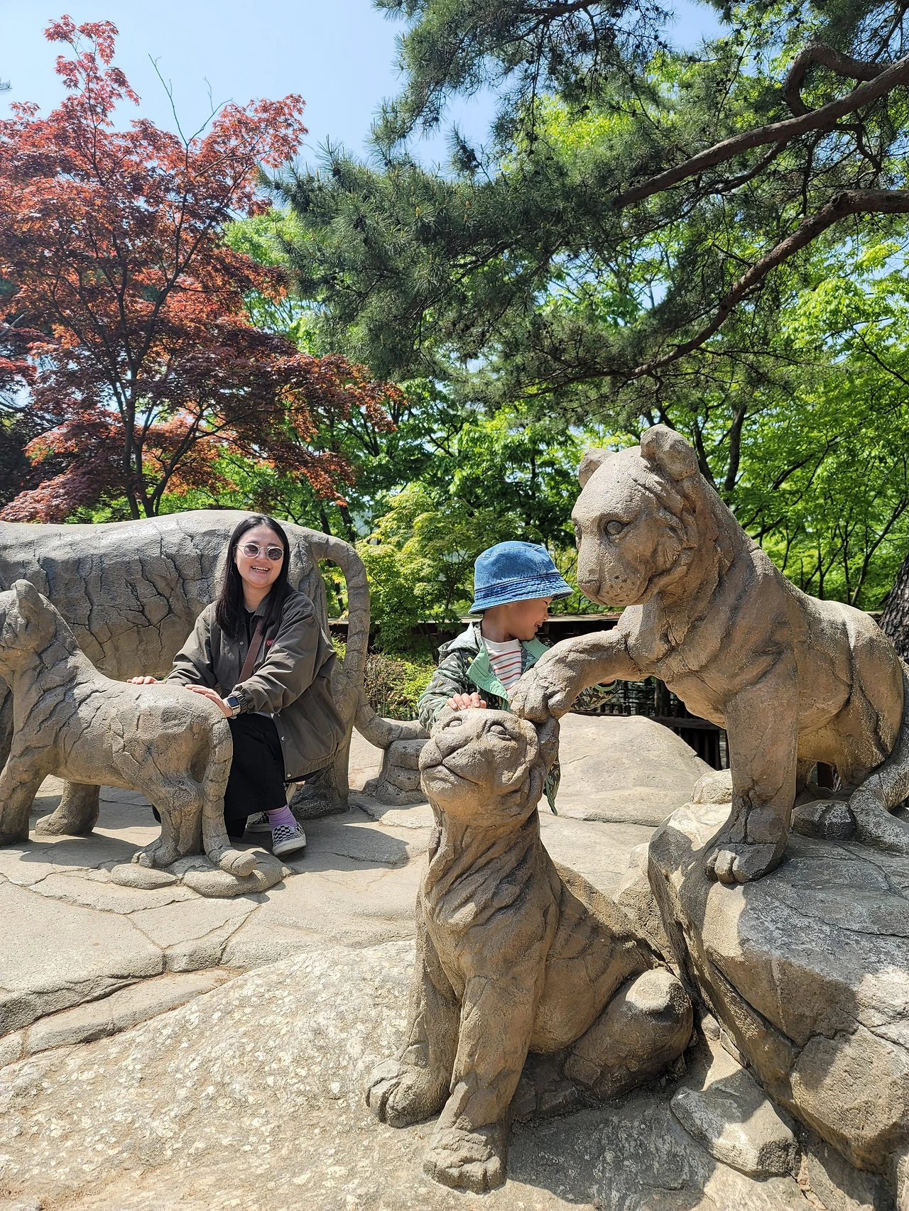 유모차에서 탈주하는 3세, 3세의 유모차를 타겠다는 4세와 함께 걷고 또 걸었다. 연한 잎을 낸 커다란 나무들이 바람에 흔들렸다. 산책만 해도 좋은 풍경이 계속해서 이어졌다. 우리처럼 아이들도 즐기면 좋으련만. 까까와 주스로 달래 가며 다니다가 사자우리 뷰를 가진 카페에 들어가게 됐다.