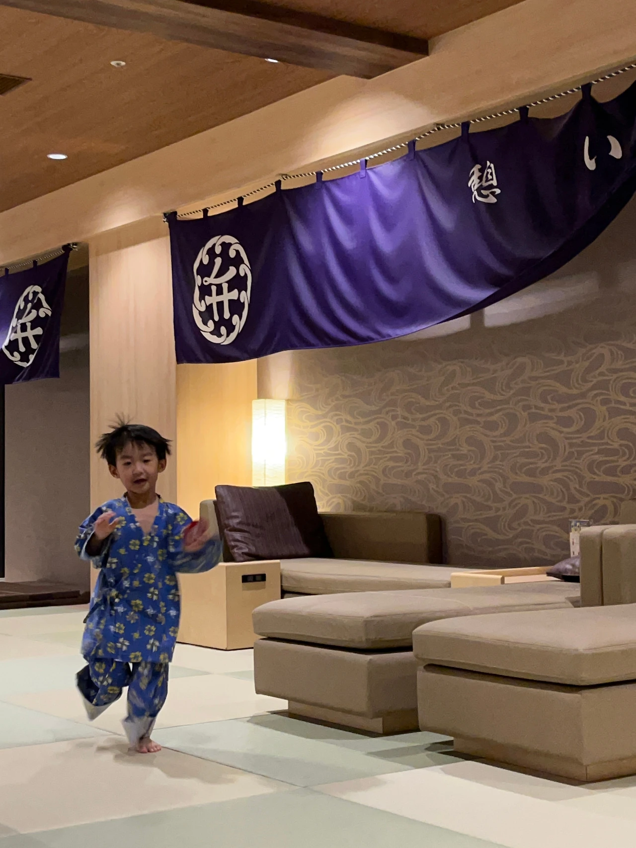 우리나라 찜질방처럼 목욕도 하고 쉬다 올 수 있는 곳. 유카타를 입어볼 수 있다. 살쪄서 퉁퉁한 내가 입어 본 것은 별 감흥이 없었고 작은 유카타를 입은 네 살이 너무 귀여웠다. 탕에서 길게 몸을 지질 순 없었지만 따뜻한 물로 씻고 시원한 커피도 마시고 하이볼과 함께 저녁까지 해결하니 휴양이 따로 없었다. 사람이 별로 없을 때 방문해서 휴게실을 통째로 빌린 기분이었다. 네 살이 신나게 뛰어놀다 낮잠까지 쿨쿨 잔 덕에 우리도 좀 쉬었다.