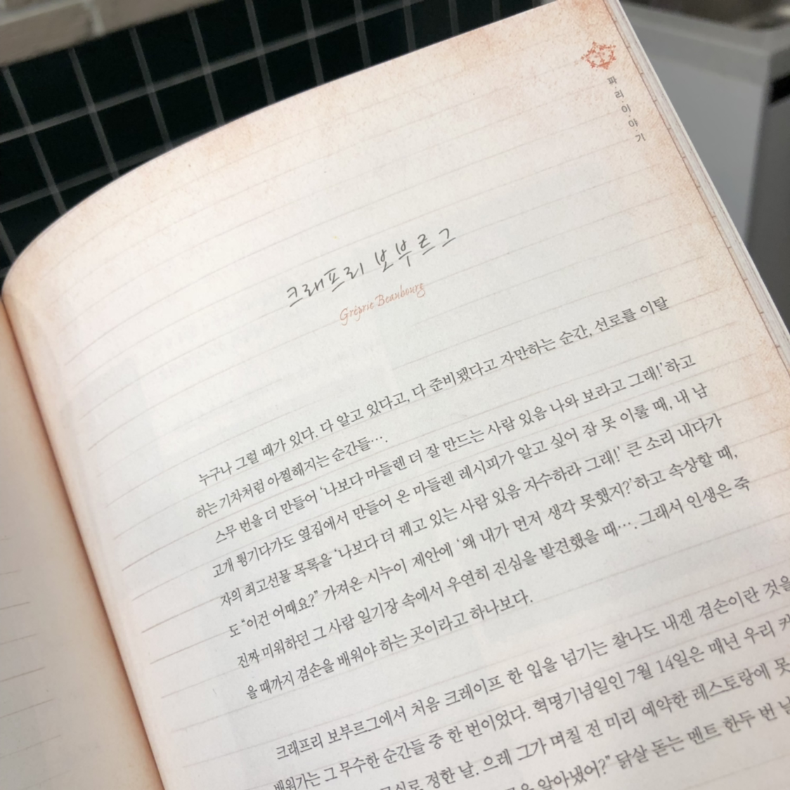빵을 너무 사랑해서 결국은 파리지앵이 된 사람의 빵 이야기. 작가의 빵 이야기를, 파리의 이야기를 듣고 있노라면 마치 나도 그와 같이 파리를 걸으며 파리의 맛있는 빵을 먹고 있다는 착각에 빠진다. 그만큼 작가의 어조에는 빵과 그것을 담은 파리를 향한 사랑으로 가득 차 있었다. 혹시나 하는 마음으로 펼쳤던 책을 반 쯤 읽었을 때, 이미 작가가 들려주는 이야기에 젖어있는 나를 발견했다. 시간이 부족해 읽고 있던 부분을 표시 해둔채로 가게를 나섰다.