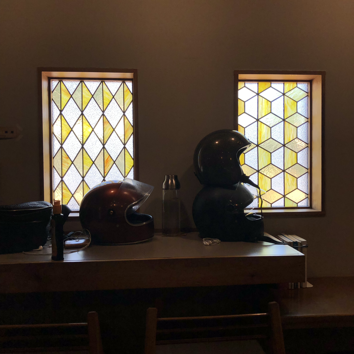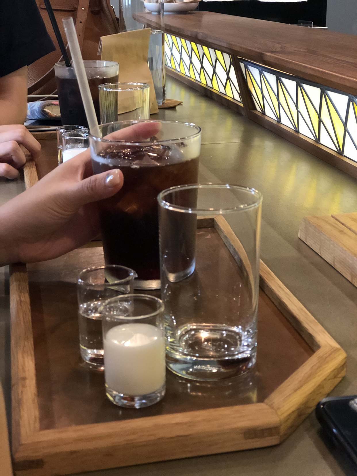 깔끔한 패턴의 스테인드 글라스 덕분에 그렇게 밝고 뜨겁던 외부의 빛이 차단되어 은은하고 차분한 공간으로 금방 순간이동한 듯, 카페 내부 분위기에 매료되었다. 각각 쟁반에는 미리 시럽과 빈 컵이 준비되어 있었는데, 앉은 자리에서 이동 없이 커피만을 충분히 즐길 수 있도록 배려 받는 기분이었다.