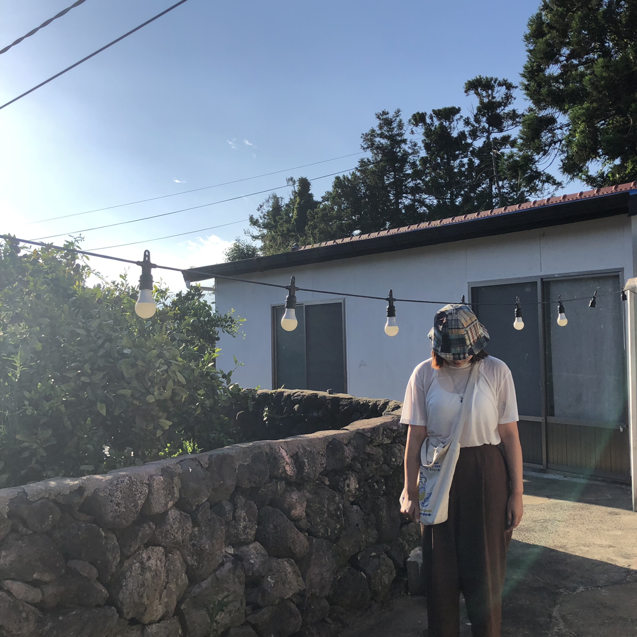 집을 둘러싼 돌담과 제주에서 자주 보이는 수목들이 어우러진 360도 풍경. 그리고 센스있는 노란 알전구까지. 어느 것 하나 빠지지 않고 감동적인 숙소. 적어도 나에게는 그랬다.