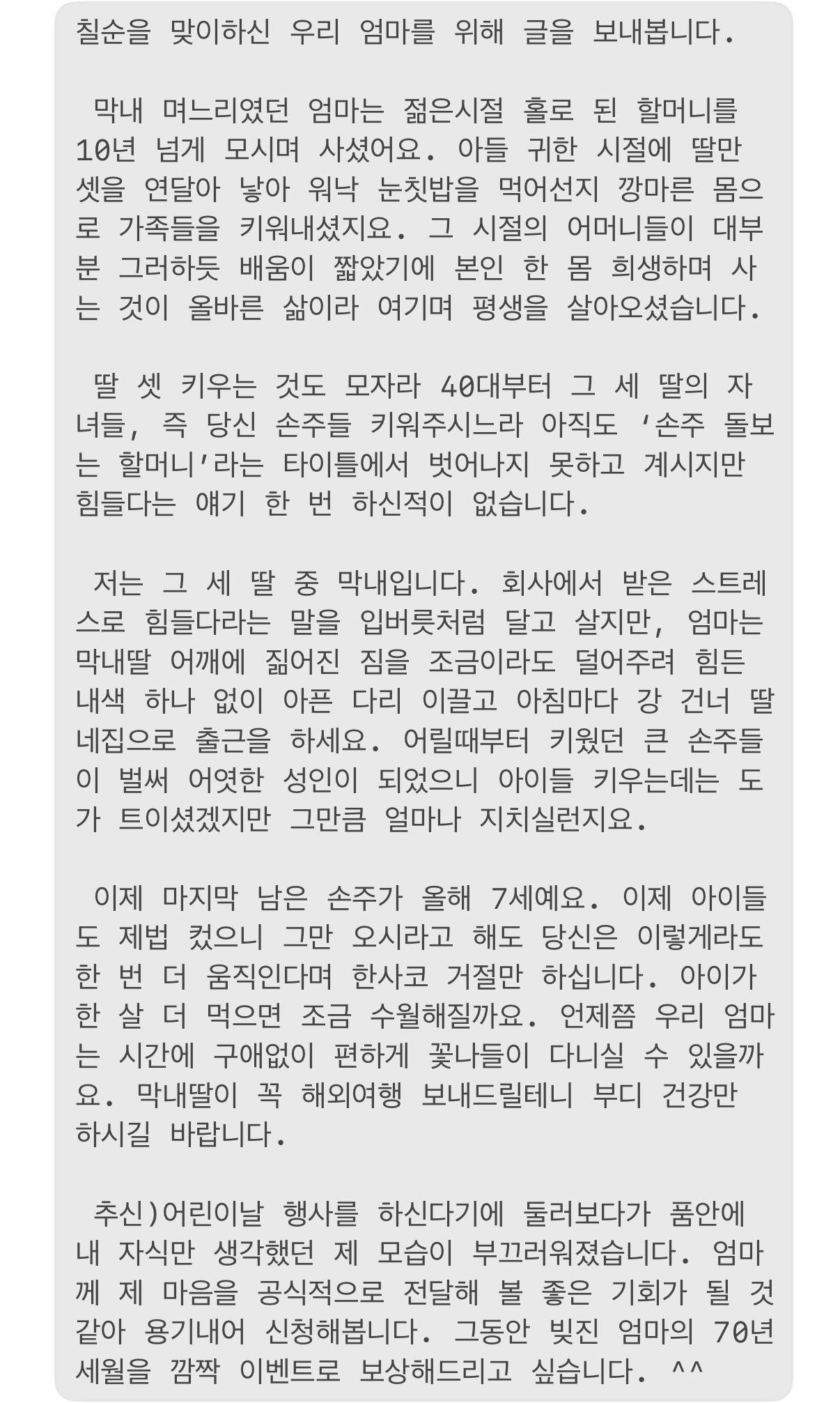 2주쯤 지나 감사하게도 당첨 메시지를 받았다. 칠순의 영향이 컸던 걸까. 어찌 되었든 서프라이즈 이벤트는 언제나 설레는 일. 난생처음 보는 사람이 집으로 케이크와 꽃다발을 들고 찾아올 것이다. 그럼 엄마는 “오메오메 뭔 일이래요.” 하며 깜짝 놀라면서도, 새는 웃음을 참느라 입술을 달싹달싹하시겠지. 그날 하루만큼은 소녀처럼 행복해하실 모습을 상상하니 내 가슴이 벌써부터 발랑거린다.
