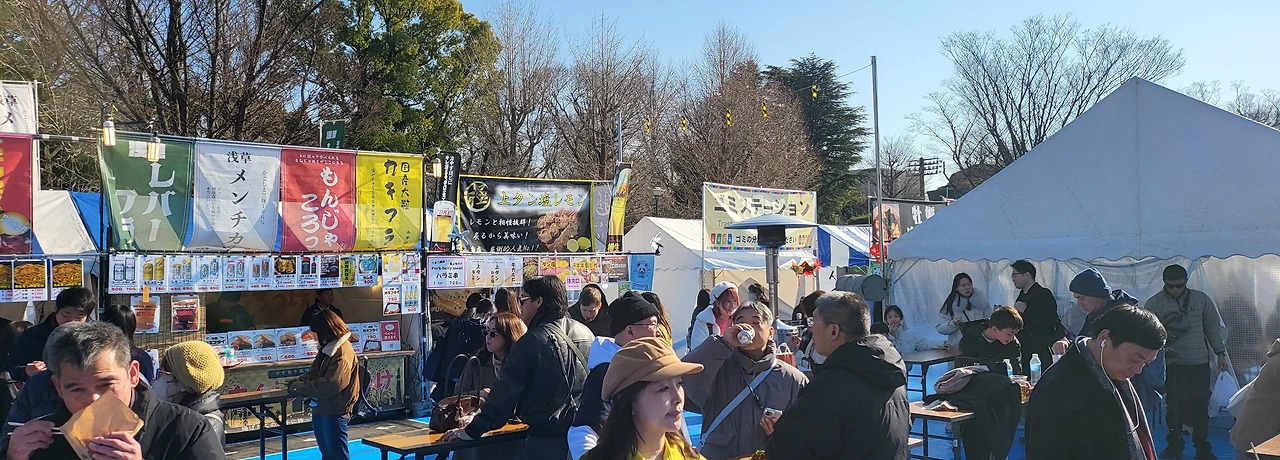 우에노 역에서 가까운 무라시노 커피에서 향 좋은 드립커피를 마시고 한국어를 잘하는 직원이 추천해 준 소바집으로 향한다. 우에노 역은 아주 붐볐는데 간단히 우동으로 요기를 하고, 기차 역사와 평행인 상가의 에스칼레이터를 타고 위로 올라가니 우에노 공원과 서양미술관 도쿄국립 박물관 등이 펼쳐져 있다. 우에노 공원 안은 구정연휴 축제인지 판다동상과 푸드트럭 그리고 버스킹이 한창이다.