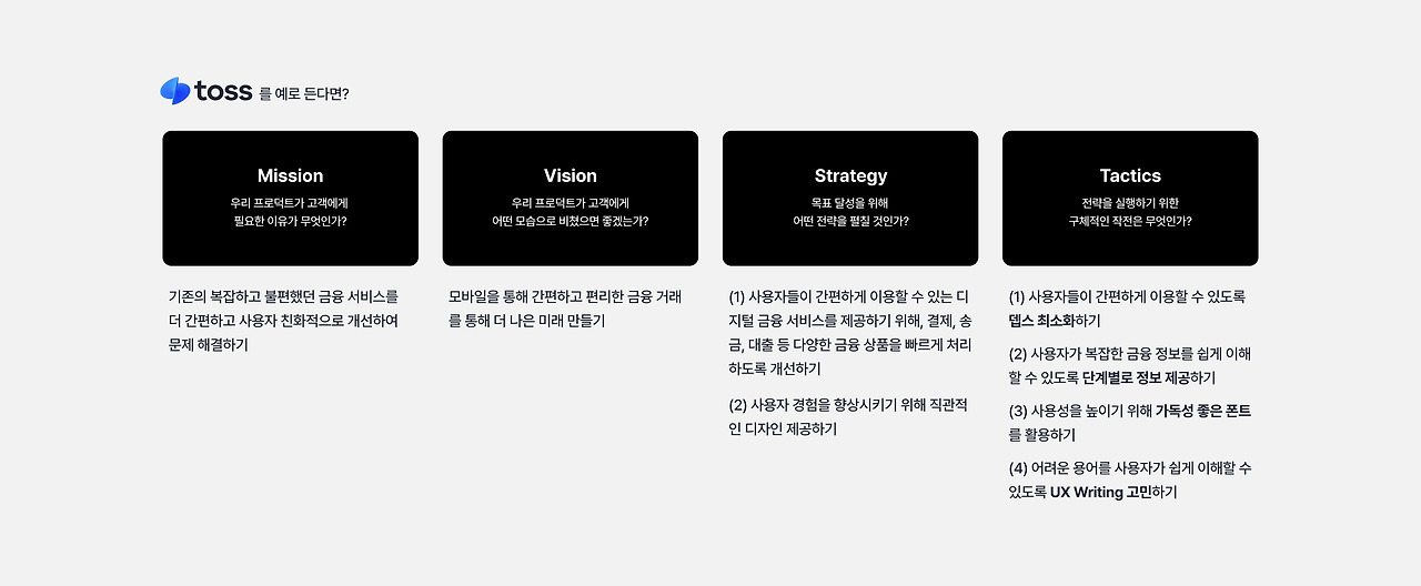 프로덕트 구체화 과정은 미션, 비전, 전략, 전술 총 네 단계로 이루어져 있다. 이번 기회에 이 네 단계를 금융 서비스 '토스'를 예시로 사용하여 정리해 보려고 한다. (단순한 예시일 뿐이다.)