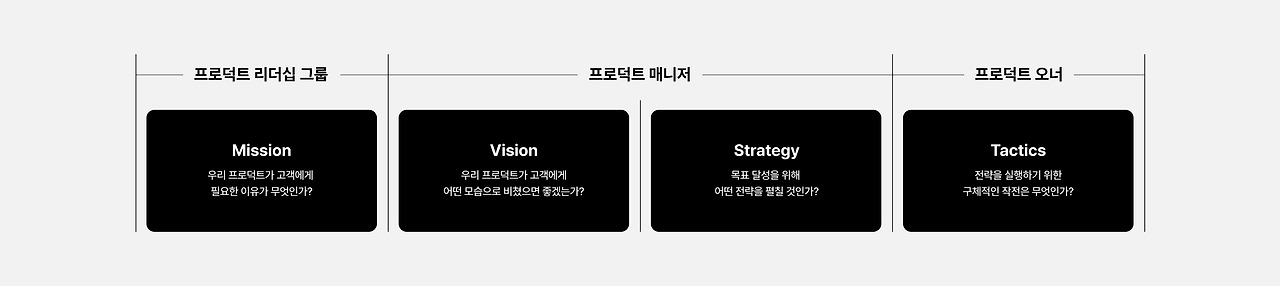 (2) 그다음으로 2단계인 비전은 프로덕트 매니저가 맡게 된다. 비전 단계에서는 고객들이 우리 제품이 고객에게 어떤 모습으로 비쳤으면 좋을지 고민하고 설정하는 단계를 의미한다. '토스'의 비전은 모바일을 통해 간편하고 편리한 금융 거래를 통해 더 나은 미래 만들기'일 것이다. 이 단계에서 프로덕트 매니저는 동시에 제품의 로드맵을 수립해야 한다.