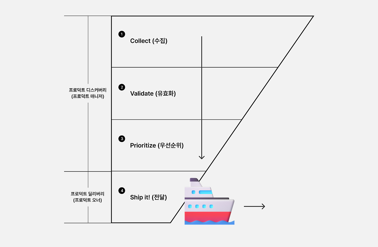 그림을 보면 알 수 있듯이, 프로덕트 매니저는 프로덕트 오너보다 상위의 전략을 수립하는 역할을 한다. 프로덕트 매니저는 프로덕트 디스커버리(문제 발견)를 담당하며, 최대한 여러 관점의 아이디어와 데이터를 수집하고, 프로덕트 미션과 비전에 부합하는 아이디어를 선택하는 데 집중한다. 그리고 선택된 아이디어에 우선순위를 부여한다. 이후, 프로덕트 오너는 부여된 우선순위를 바탕으로 타임라인에 맞춰 프로덕트를 고객에게 딜러버리(전달)하는 역할을 수행한다. 간단히 말해, 프로덕트 매니저는 문제를 발견하고 아이디어를 선별하는 데 중점을 두고, 프로덕트 오너는 이러한 아이디어를 구현하고 고객에게 전달하는 데 주력한다. 더 나아가, 프로덕트 오너는 아이디어를 구체화하여 에픽과 사용자 스토리를 작성하며, 프로덕트 개발에 적극적으로 참여한다.