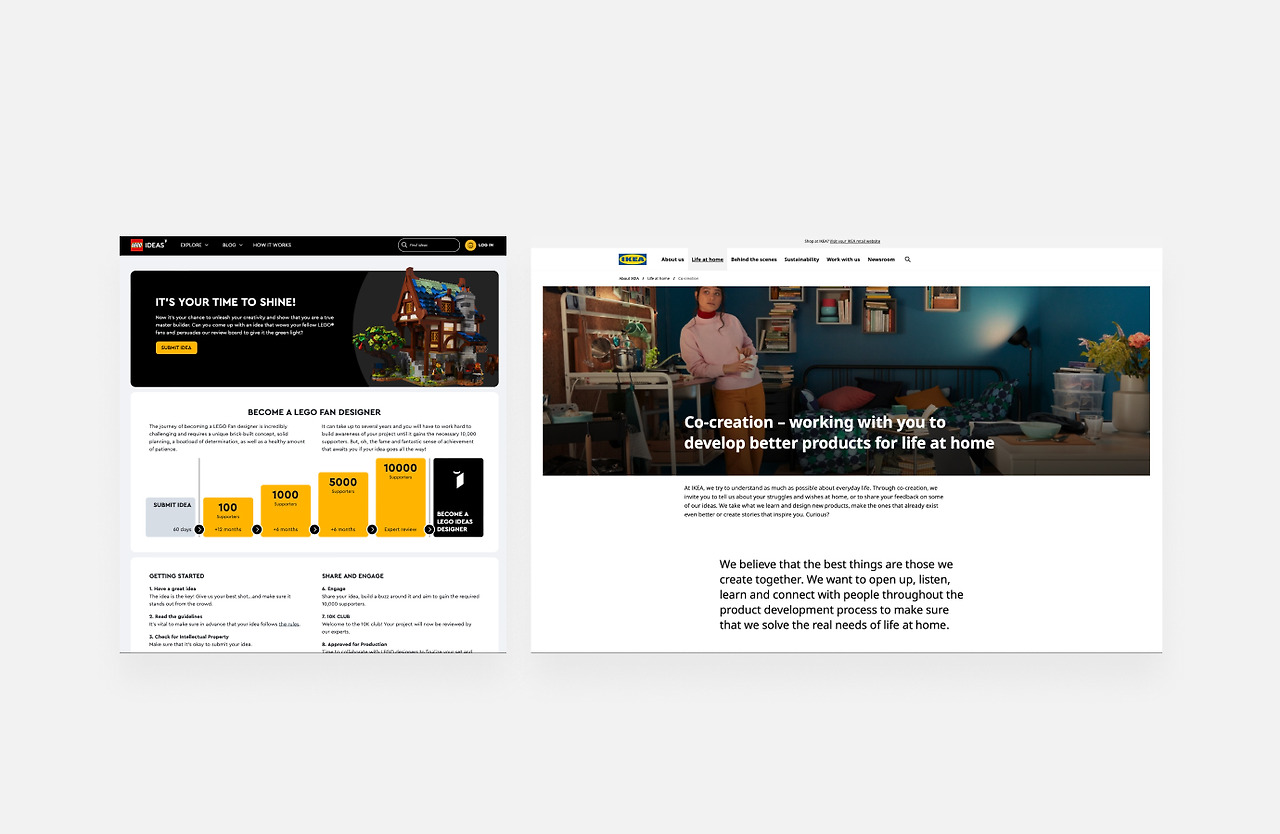 <LEGO>, <IKEA>와 같은 기업들은 다양한 혁신 아이디어를 모으기 위해 고객 참여감 고취형 커뮤니티를 운영하고 있다. (현재는 없어진 것으로 보이지만, <스타벅스>도 과거에 이와 유사한 커뮤니티를 운영하며 창의적인 아이디어 제품을 선보였다.) 국내 일부 스타트업에서는 서비스 내 배너를 통해 고객들의 의견을 수렴하여 서비스 개선에 반영하는 방식을 채택하고 있다.