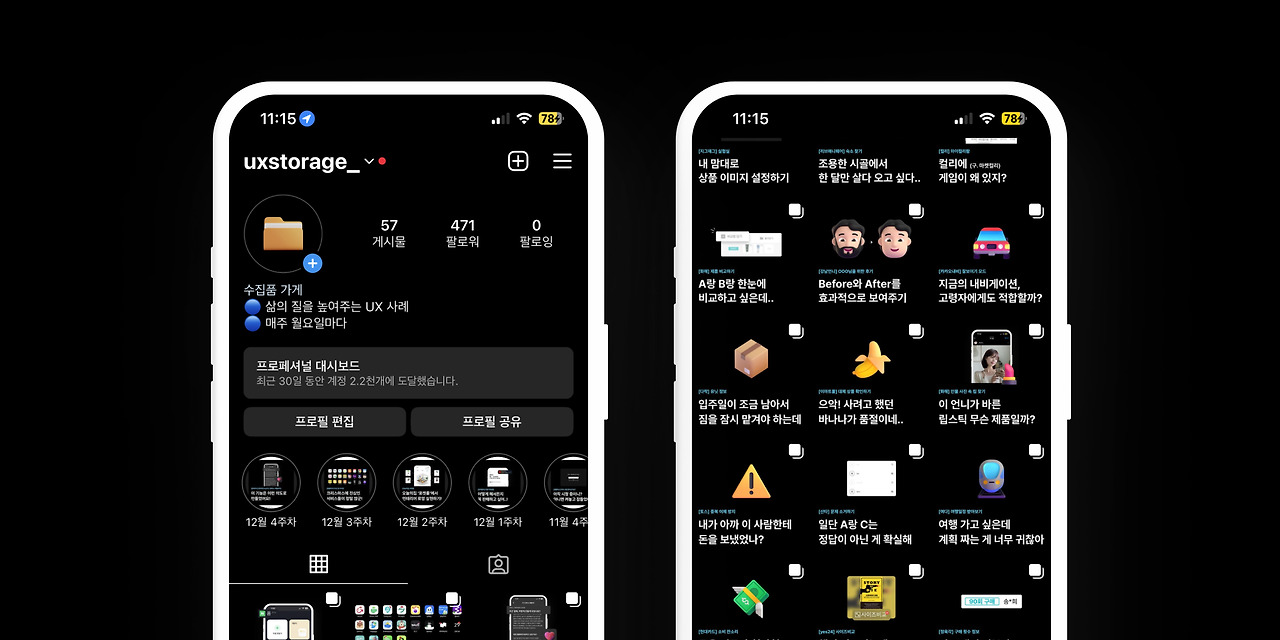 8월 마지막 주에 무슨 바람이 불었는지, 기존에 있던 모든 게시물을 지우고 일주일에 3개씩 새로운 게시물을 올리기 시작했다. 그리고 12월 마지막 주인 지금까지 한 주도 빠지지 않고 매주 3개씩 올리고 있다. 그 결과, 8월 말 60여 명이었던 팔로워가 12월 말인 지금 470명으로 약 680% 성장하였다. 성장 배경으로는 Surfit이 삶의 질을 높여주는 10가지 UX 사례를 스크립해 준 덕분도 있었고 매주 5,000원씩 광고를 돌리고 있는 영향도 있을 것이다. 때로는 바쁜 일정 때문에 콘텐츠를 3개씩 올리는 것이 힘들 때도 있지만, 내년에도 매주 3개씩 꾸준히 업로드할 계획이다.