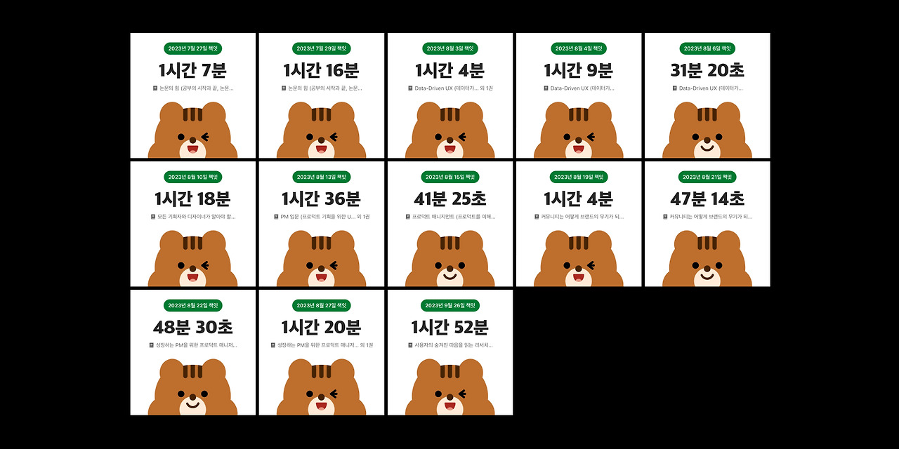 이런 기준으로 보면, 작년의 나보다 올해의 나는 성장했다고 할 수 있을 것 같다. 나처럼 올해를 잘 살았는지, 성장했는지 불안한 사람들은 남들과 비교하지 말고, 작년의 나와 비교해 보면 좋을 것 같다는 생각이 든다. 작년보다 성장했다면, 올해를 잘 살았다고 스스로 칭찬하며 건강하게 한 해를 마무리하면 좋겠다. 이 글을 읽는 모든 사람들이 2024년에도 '점진적 우상향'을 이루고, 정신적, 육체적으로 건강한 한 해가 되길 기원한다.