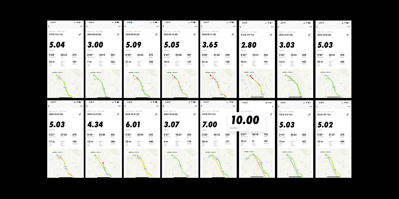 원래는 주 5회 정도 헬스장을 다녔지만, 학기가 시작되면서 시간을 내기 어려워졌다. 그래서 9월부터 집 앞 천을 달리기 시작했다. 달리기는 짧은 시간에 효과적으로 운동을 할 수 있었고, 잠도 깨고 땀도 충분히 흘려서 기분도 좋아지는 장점이 있었다. 심지어 킬로미터를 늘려가며 도전해 목표를 달성하면, 짧은 시간 안에 성취감도 느낄 수 있는 좋은 운동이라는 생각이 들었다. 그 결과, 달리기는 나에게 애정하는 취미로 발전하였다. 지금은 날이 추워져서 다시 헬스장으로 돌아왔지만, 날이 풀리면 다시 달리기를 시작해서 내년에는 10km 마라톤 또는 하프 코스 마라톤에 출전할 계획이다.