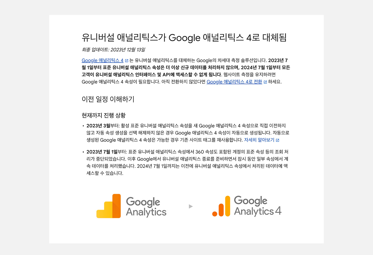 2005년에 버전 1로 출시된 구글 애널리틱스는 2020년에 버전 4(GA4)를 맞이했다. 버전 4 출시 이후에도 이전 버전인 버전 3(UA)이 여전히 많은 사용자들에게 사랑받았지만, 구글 정책에 따라 2023년 7월부터 더 이상 사용할 수 없게 되었다. 이에 따라 버전 3을 사용하던 사용자들은 새로운 버전인 구글 애널리틱스 4를 학습해야만 했다.