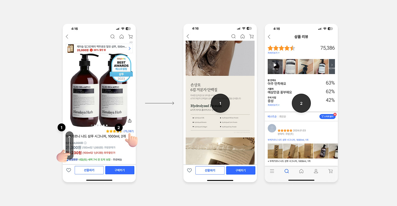 고관여 행동을 찾는 것은 우리 비즈니스에 들어온 사용자들이 구매하기 전에 어떤 정보를 탐색하며 시간과 노력을 들이는지 파악하는 것이다. 예를 들어, 국내 대표 이커머스 '쿠팡'에서 샴푸를 구매하기 위해 상세 페이지로 진입한 사용자가 100명이라고 가정해 보자. 이 중에서 구매를 완료한 사용자는 10%. 이 10%의 구매 전 행동을 확인했더니, 3%는 제품 상세 정보를 오랜 시간 동안 스크롤해서 확인한 후 구매로 전환했고, 7%는 제품 상세를 보지 않은 채, 리뷰를 오랜 시간 동안 보고 구매로 전환한 것을 발견하였다. 이를 바탕으로 '고관여 행동'은 리뷰를 상세하게 보는 것이라는 것을 알 수 있다. 이러한 고관여 행동을 관측했으면, 이를 극대화해 전환율을 높일 수 있는 전략을 수립해야 한다. 예를 들어, 우리 서비스에서 구매를 많이 하는 사용자들은 고객의 리뷰를 중요시한다는 가설을 세우고, 서비스 홈에 좋아요를 많이 받은 리뷰 일부를 배치할 수 있다. 또는, 리뷰 작성 시, 포인트를 지급하여 서비스 내 리뷰의 수를 늘리는 전략을 취할 수도 있다. 이처럼 구글 애널리틱스를 활용해 고관여 행동을 찾고, 전략을 수립해 전환을 극대화시키는 용도로 활용할 수 있다.