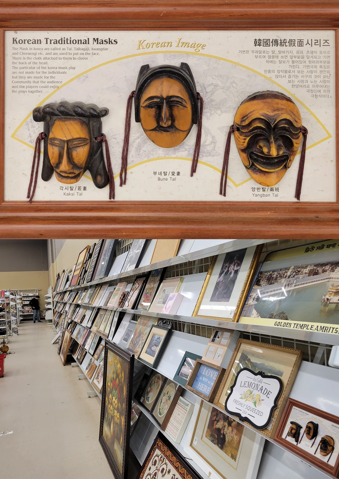 나는 익숙하게 그림 진열대로 발길을 옮겼다. 그곳에서 눈에 띄는 액자 두 개를 발견했다. 액자 안에는 ‘Korean Traditional Masks – Korean Image’라는 이름으로 각시탈, 부네탈, 양반탈, 이렇게 세 가지 탈 모형이 담겨 있었다. 가격은 하나에 5.99달러. 부담 없는 가격이었고, 마치 보물을 발견한 것처럼 반가웠다. 그러나 집사람은 집에 이미 비슷한 탈 모양의 액자가 있다며 구매를 만류했다. 실제로 우리 집 현관과 방에는 예전에 이곳에서 구입한 88 올림픽 기념 티스푼 액자와 탈 액자가 걸려 있다.
